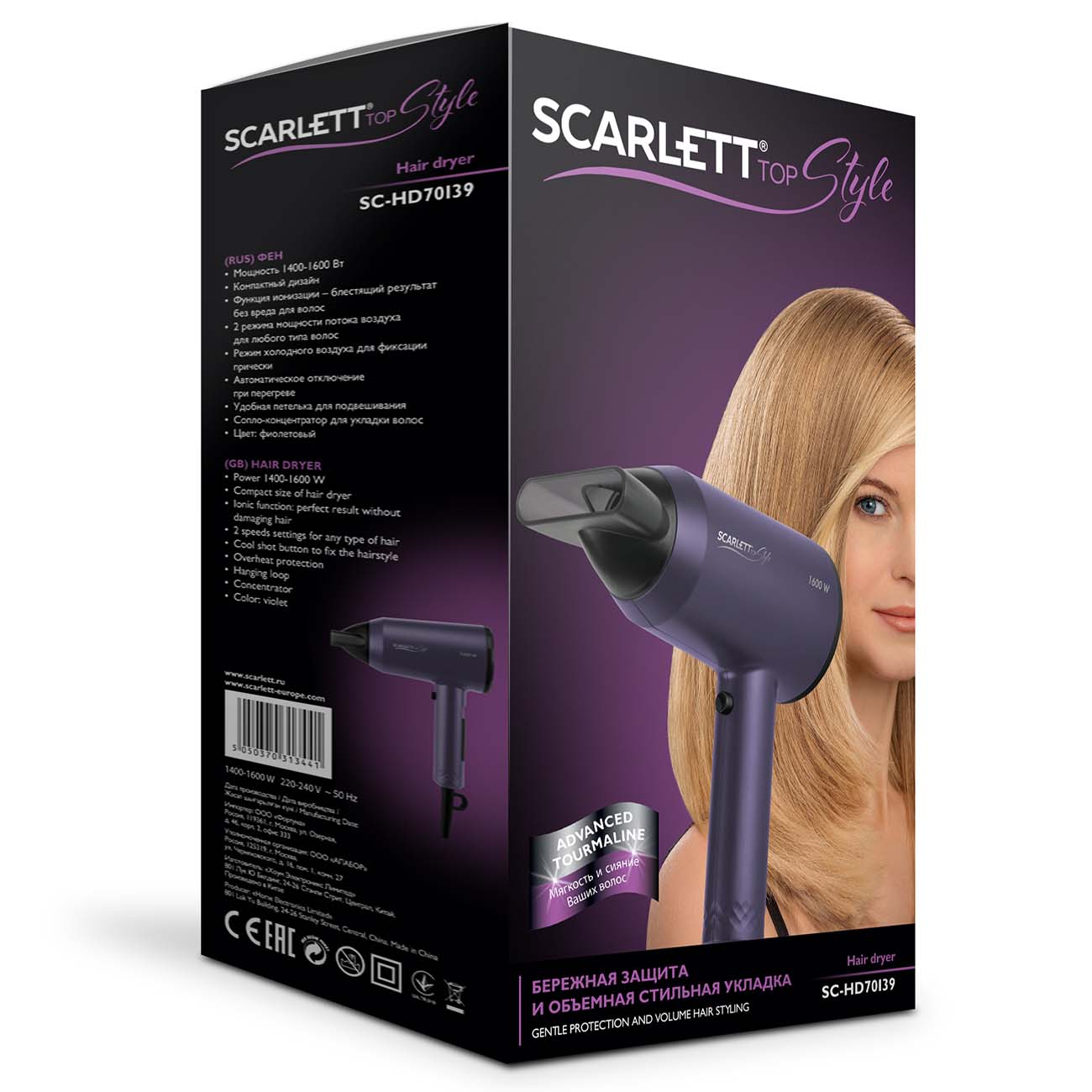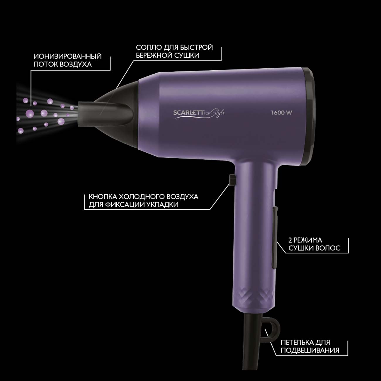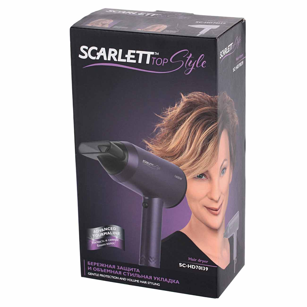 Фен Scarlett SC-HD70I39 – это компактный прибор с производительным, но тихим мотором мощностью 1600 Вт. Благодаря технологии Advenced Tourmaline (ионизация) он бережно сушит волосы, не обезвоживая их. С помощью насадки-концентратора вы сможете направить воздушный поток на отдельные пряди.