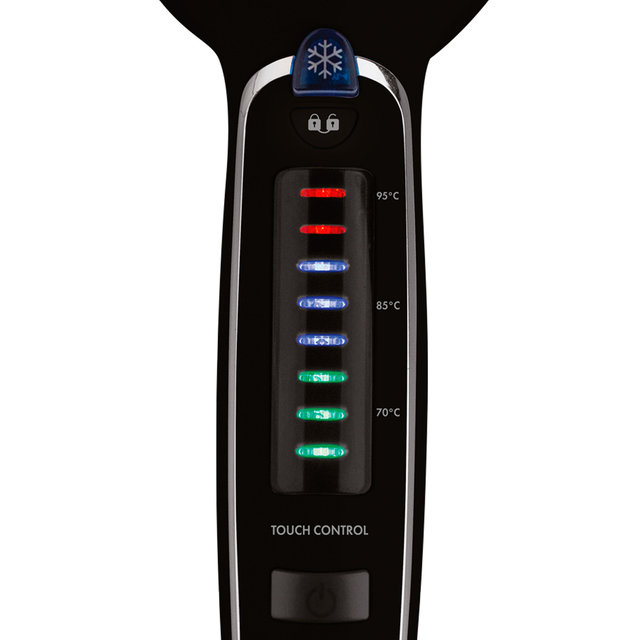 Сенсорная панель управления Touch Control снабжена трёхступенчатым индикатором, где зелёный цвет – самый щадящий (около 70 градусов), а красный – наиболее горячий и мощный уровень воздействия (до 95 градусов). Для ввода нужных параметров проведите пальцем по шкале и нажмите на кнопку фиксации режима, чтобы не изменить его случайно. Укладку облегчит функция «Ионизация», которая избавит от статического электричества.