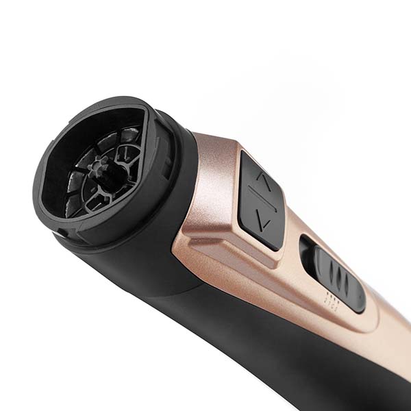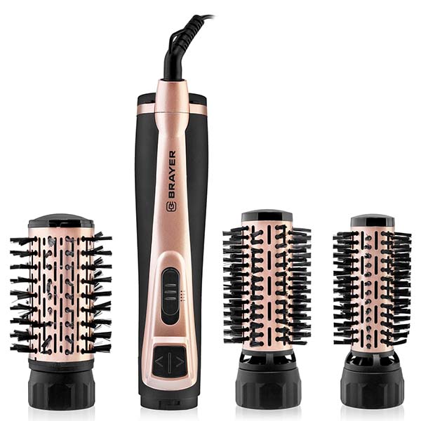 Фен-щетка Brayer 3100BR мощностью 1 кВт выполнена в пластиковом корпусе черного-золотистого цвета с петлей для подвешивания. Устройство может работать в двух скоростных режимах, которые выбираются с помощью механического слайдера.
