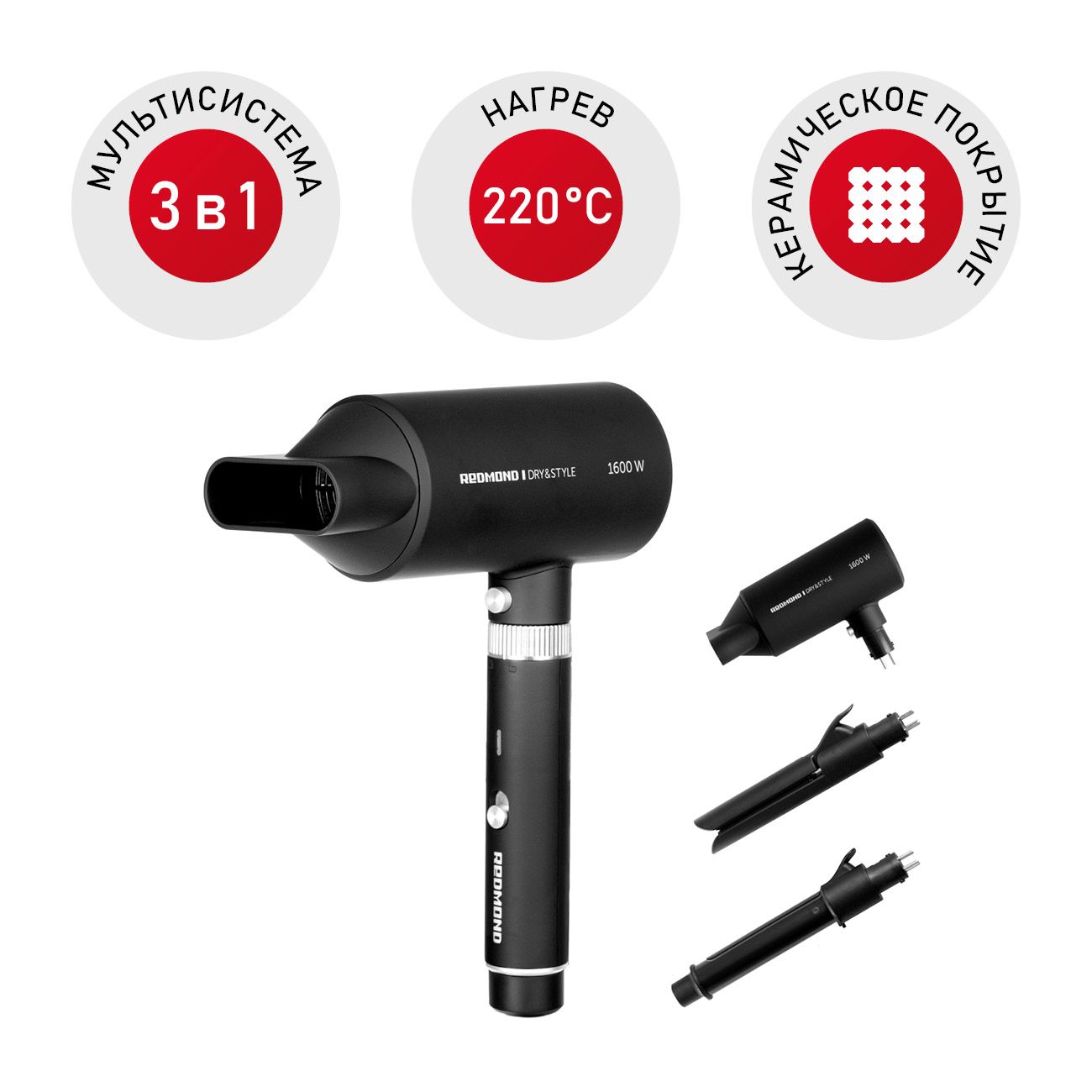 Redmond RMS-4305 – многофункциональный стайлер, с помощью которого вы сможете получить самые разные образы. Он один заменяет три прибора для укладки волос: фен, щипцы для создания локонов и выпрямитель. От вас потребуется только установить соответствующую насадку.