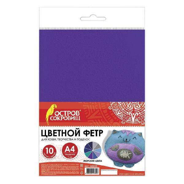 Плотность - 160 г/м2 и толщина в 1 мм гарантируют поделкам отличное качество и долгий срок службы. Цветной фетр формата А4 поставляется в упаковке по 10 листов, 10 оттенков синего и голубого цветов. Такое разнообразие придется по вкусу любому покупателю. Фетр Остров Сокровищ обладает приятной нежной фактурой, прост и удобен в использовании. Края не осыпаются при разрезании, благодаря чему не нуждаются в дополнительной обработке.