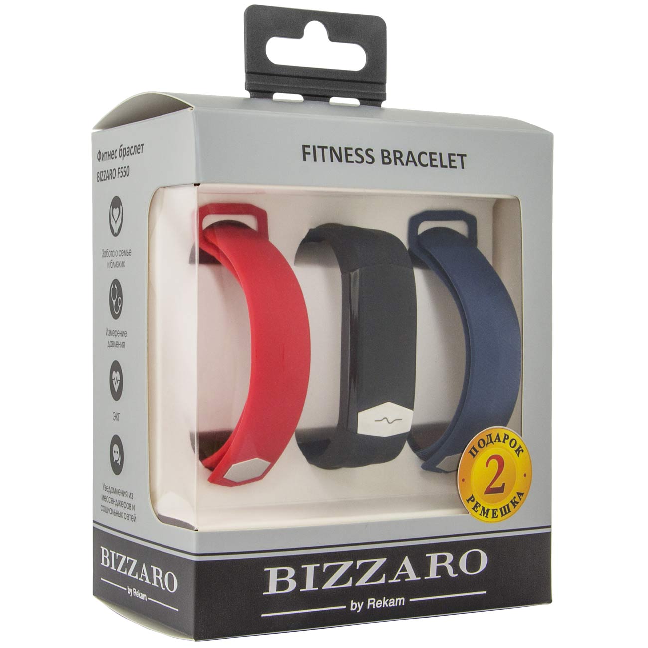 Smart-браслет Bizzaro F550 отслеживает уровень физической активности и ведёт мониторинг состояния здоровья. Он оценивает частоту сердечных сокращений и артериальное давление, составляет электрокардиограмму и рассчитывает количество потраченных калорий. Его встроенный термометр показывает температуру окружающего воздуха.