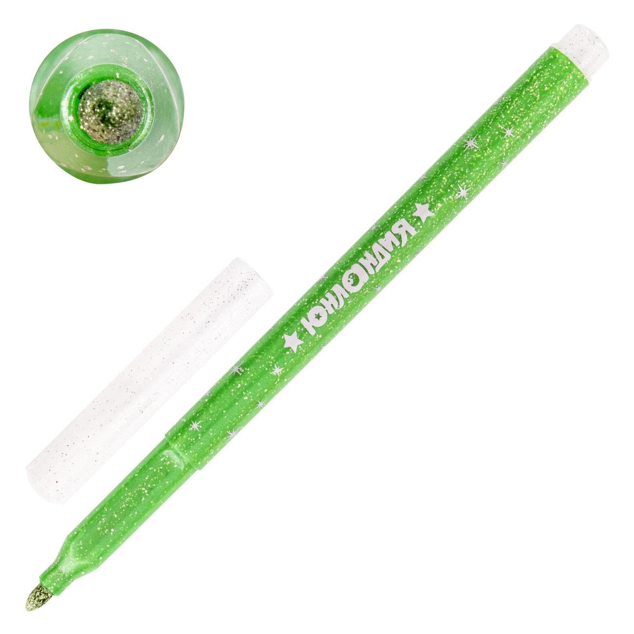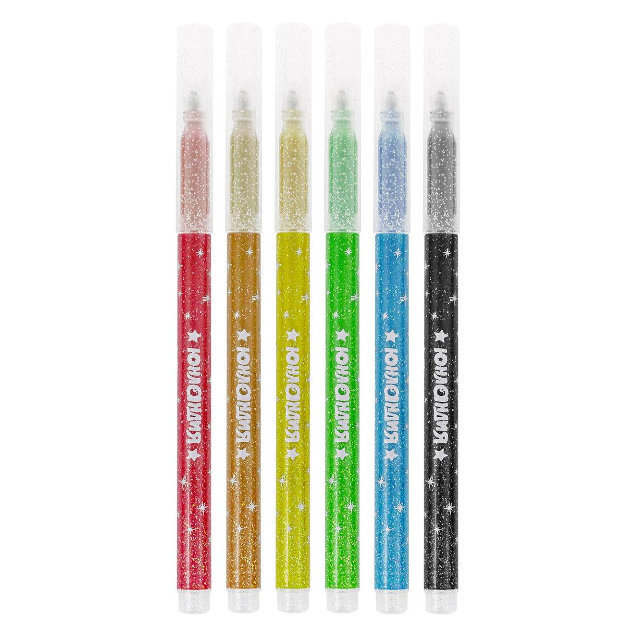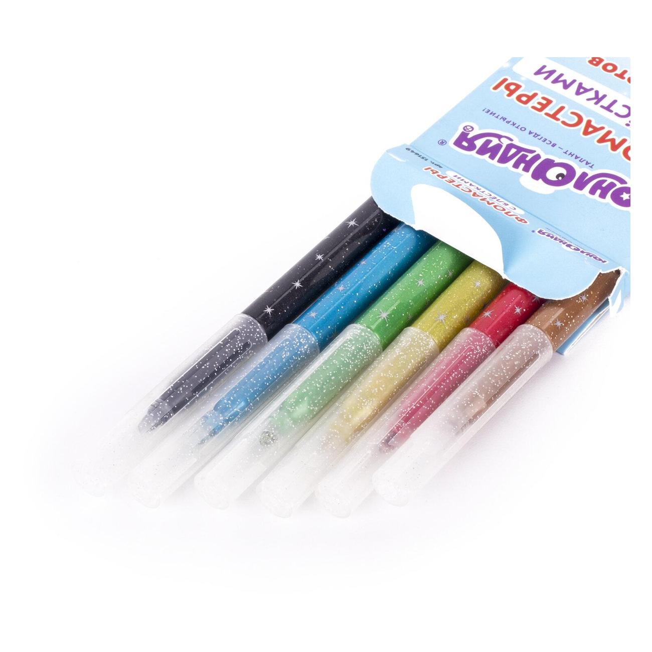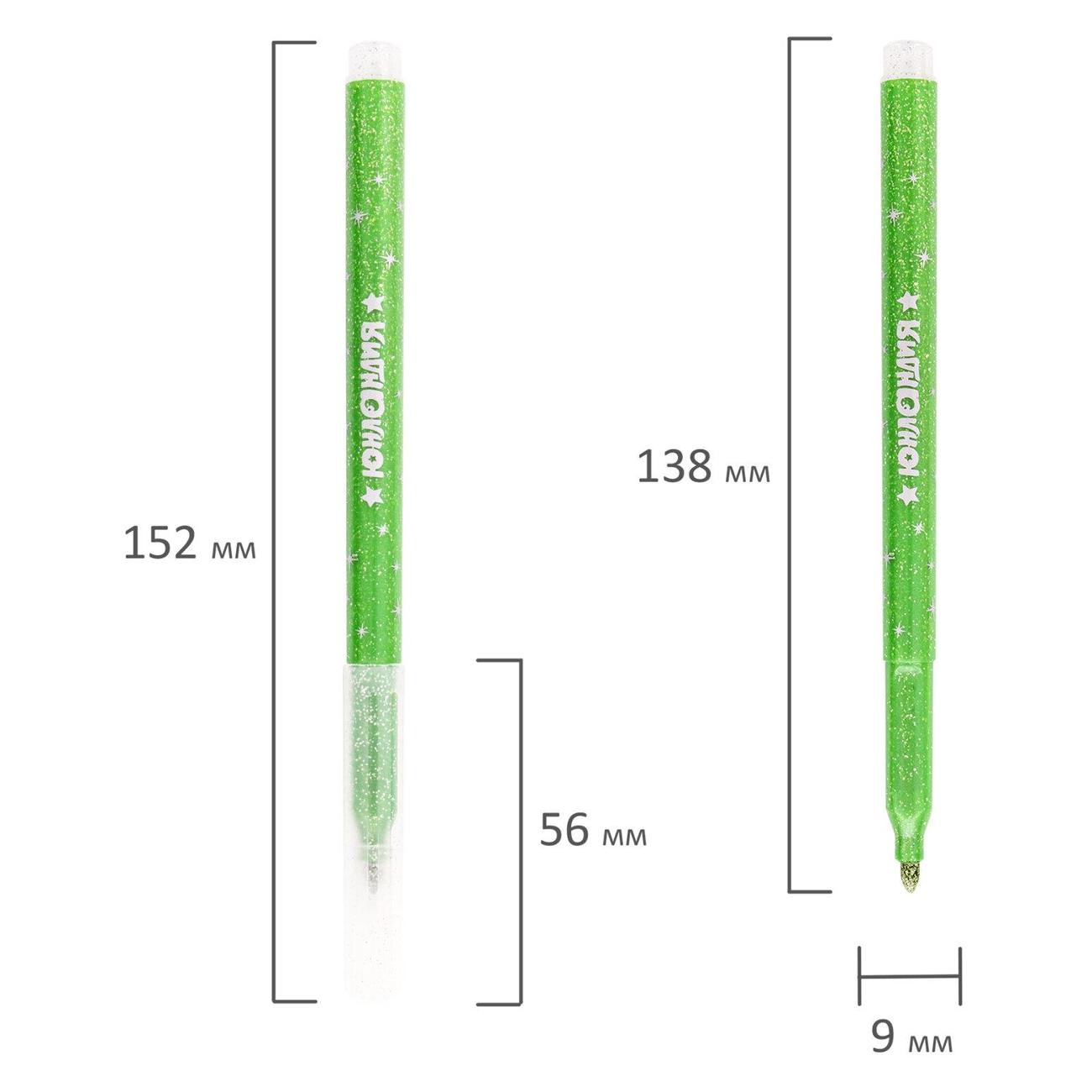 Фломастеры обладают яркими насыщенными цветами в количестве 6 штук. Имеют удобную круглую форму корпуса, длина которого 152 мм, а диаметр - 9 мм, и удобную трехгранную зону захвата. Благодаря толщине линии письма 2 мм и диаметру пишущего узла 3,2 мм процесс раскрашивания становится легким. Длина письма составляет 450 м: такого расхода хватит надолго. Блестки создают волшебный эффект сверкания рисунка, что дает яркий стимул к развитию творческих талантов у детей. Фломастеры изготовлены на водной основе, поэтому они безопасны и легко смываются с большинства материалов и кожи. Наконечник, устойчивый к продавливанию, не проваливается внутрь корпуса и не деформируется даже при сильном нажатии. Полипропиленовый корпус значительно продлевает срок службы фломастеров. Колпачок оснащен специальными прорезями для вентиляции, которые делают использование фломастеров более безопасным. Рекомендованы для детей от 3-х лет.