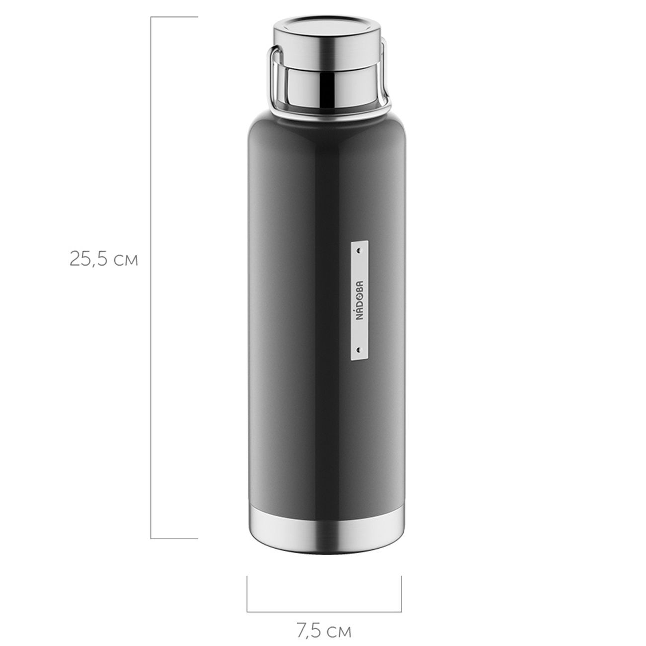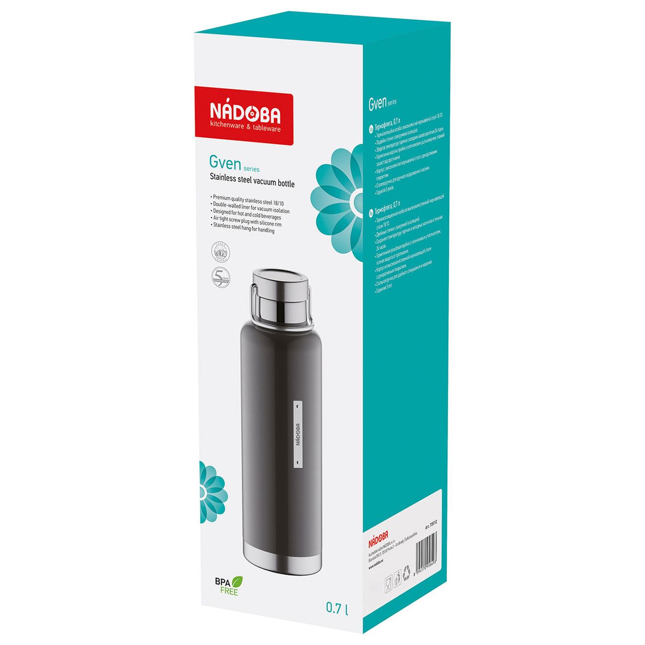 Термос Nadoba Gven 0,7 л (735112) габаритами 26х7,5х7,5 см весит 0,47 кг. Корпус изготовлен из высокопрочной стали с добавками никеля и хрома, которые предотвращают повреждение от коррозии, обеспечивают устойчивость к температурным перепадам, действию пищевых и моющих кислот и щелочей. Благодаря двойным стенкам колбы температура холодных напитков сохраняется в течение суток, горячих — 12 часов.