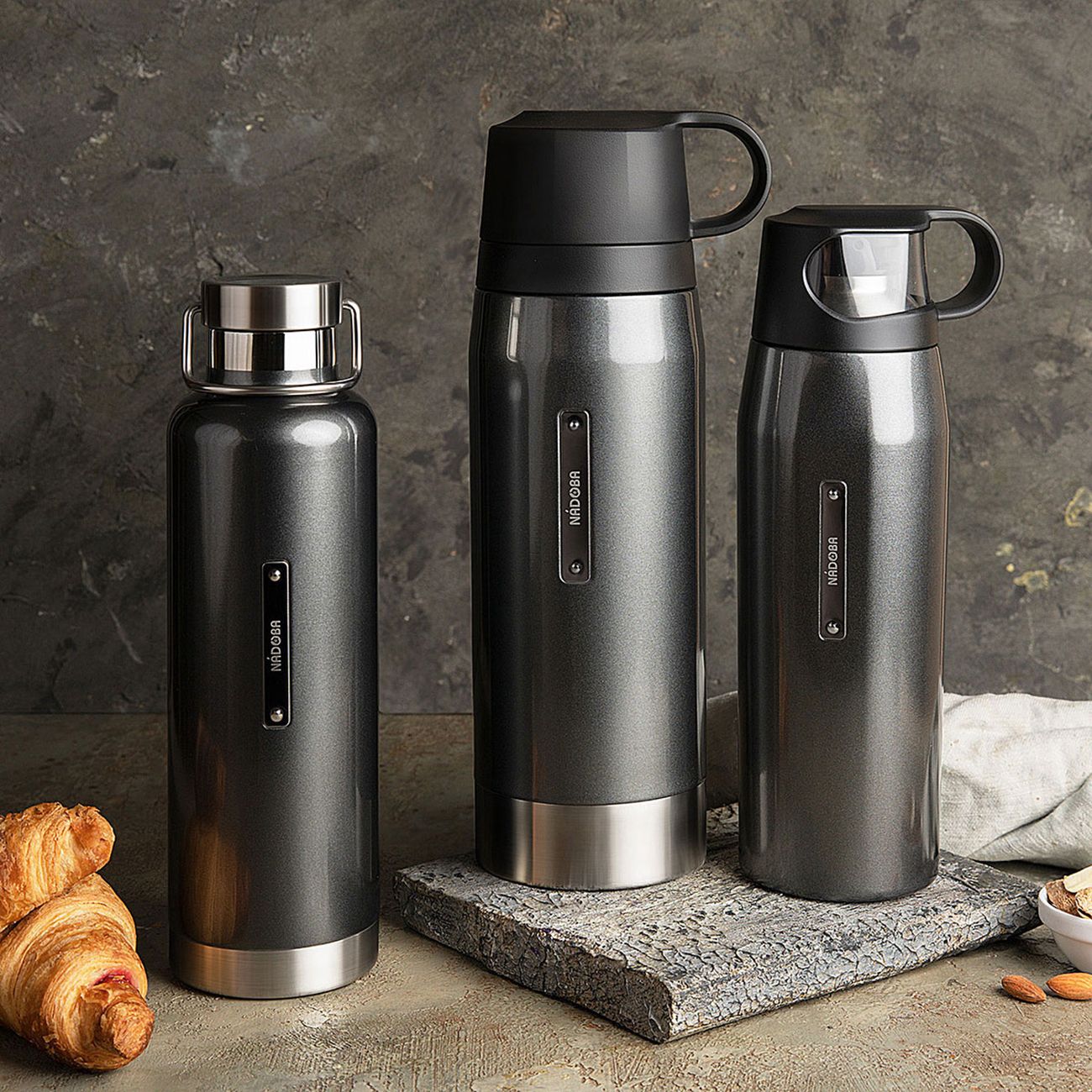 Пробка на резьбе с уплотнителем из силикона герметично закрывает горлышко, что исключает случайное пролитие жидкости, поэтому модель можно переносить или перевозить в горизонтальном состоянии. Клапан открывается и закрывается одним нажатием. Крышка сверху используется как чашка, легко чистится и моется. Матовое покрытие придает эффектный внешний вид.