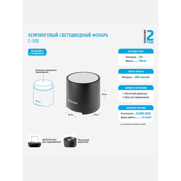 Вы можете купить Фонарь туристический Фотон 23595 С-500 (кемпинговый) в магазинах М.Видео по доступной цене. Фонарь туристический Фотон 23595 С-500 (кемпинговый): подробное описание, фото и отзывы реальных покупателей, характеристики, возможность скачать инструкции и подобрать аксессуары.