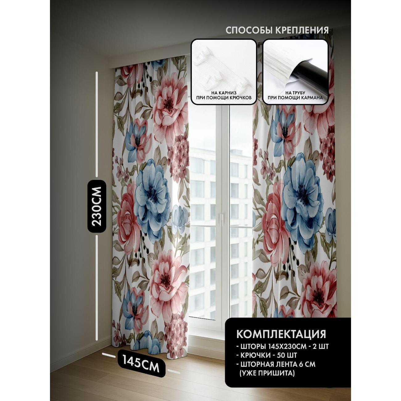 Комплект фотоштор 3D от бренда 365home с дизайном - Акварельные цветы - розовые и голубые, с листьями. Оригинальное решение, позволяющее обновить ваш дом, придать ему неповторимый стиль, красоту и подарить его обитателям комфорт и уют, а также стать надёжной защитой от городского шума и холода зимой.