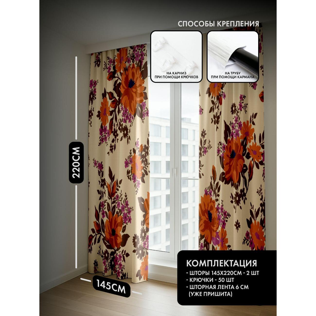 Комплект фотоштор 3D от бренда 365home с дизайном - Цветочные мотивы: оранжевые цветы, розовые бутоны, бежевый фон. Оригинальное решение, позволяющее обновить ваш дом, придать ему неповторимый стиль, красоту и подарить его обитателям комфорт и уют, а также стать надёжной защитой от городского шума и холода зимой.
