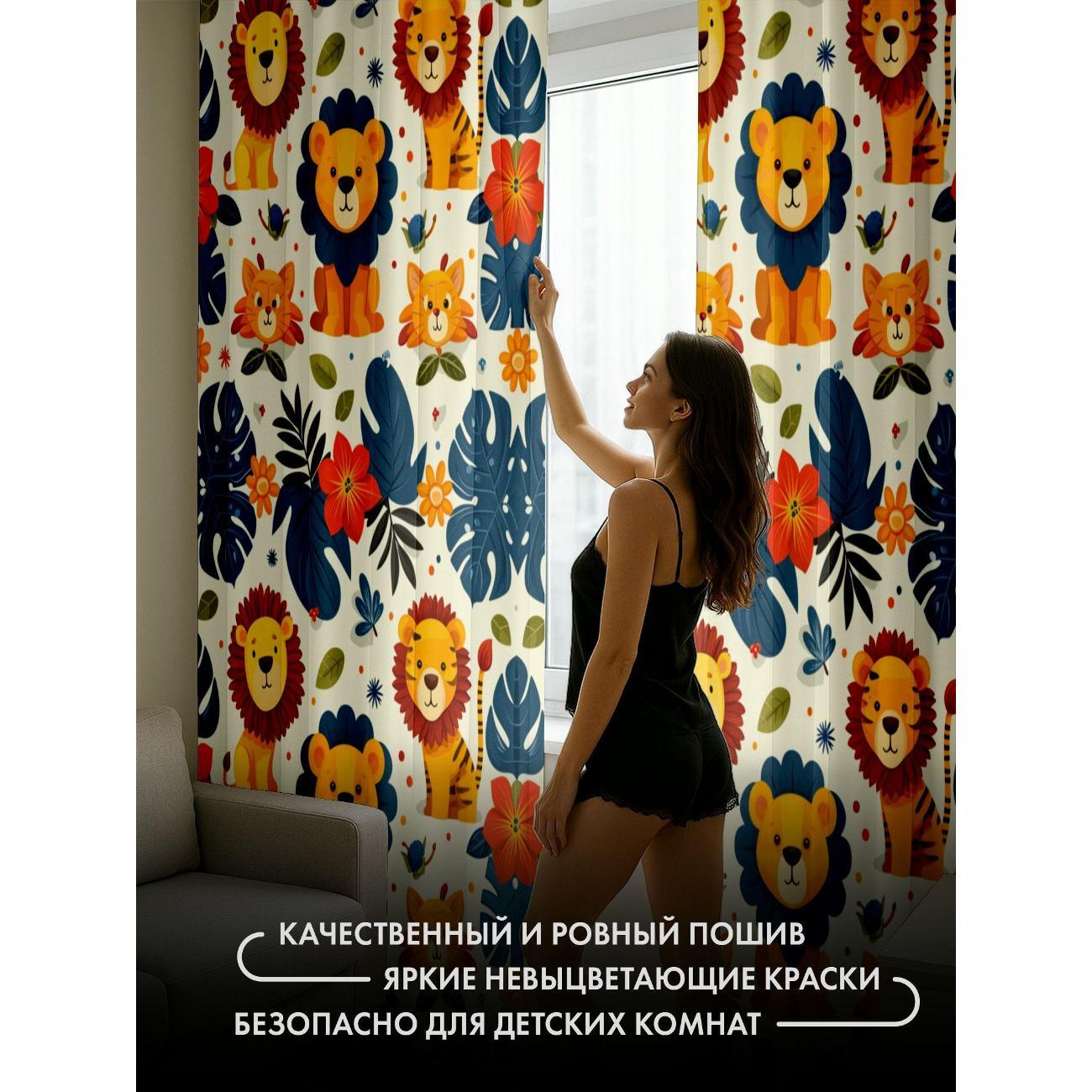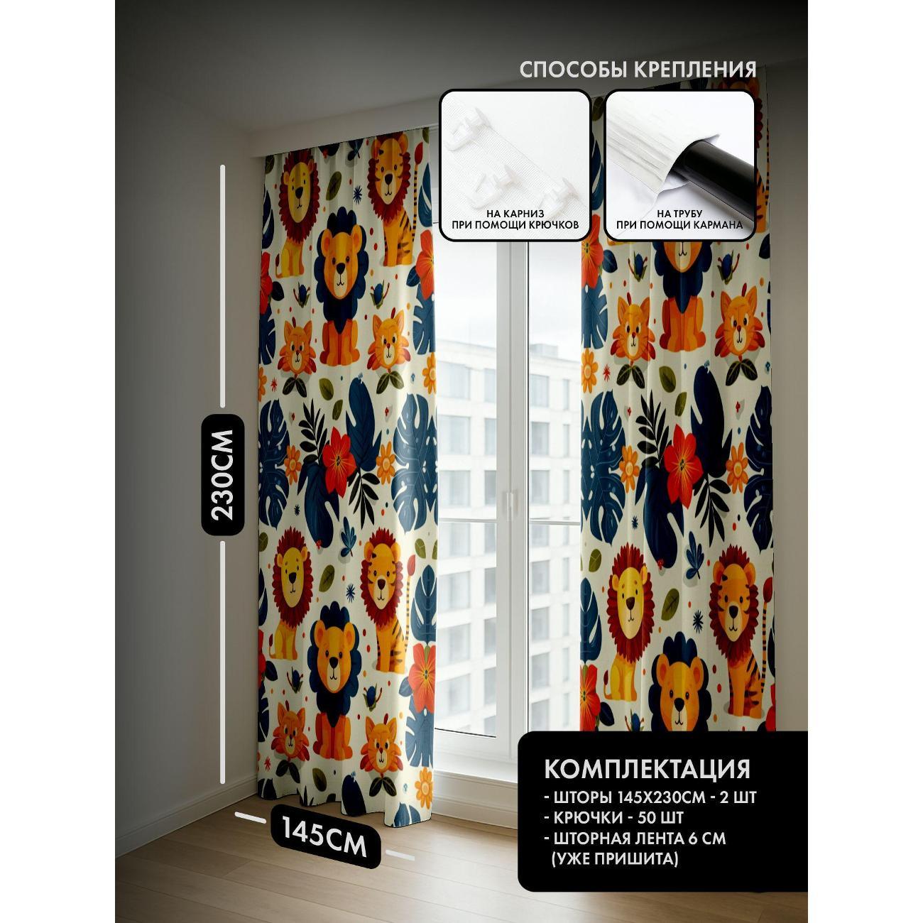Комплект фотоштор 3D от бренда 365home с дизайном - Львы, листья, цветы - яркий бесшовный узор. Оригинальное решение, позволяющее обновить ваш дом, придать ему неповторимый стиль, красоту и подарить его обитателям комфорт и уют, а также стать надёжной защитой от городского шума и холода зимой.