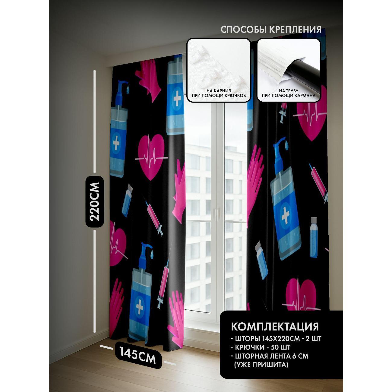 Комплект фотоштор 3D от бренда 365home с дизайном - Медицинские символы: перчатки, шприцы, антисептик, сердца. Оригинальное решение, позволяющее обновить ваш дом, придать ему неповторимый стиль, красоту и подарить его обитателям комфорт и уют, а также стать надёжной защитой от городского шума и холода зимой.
