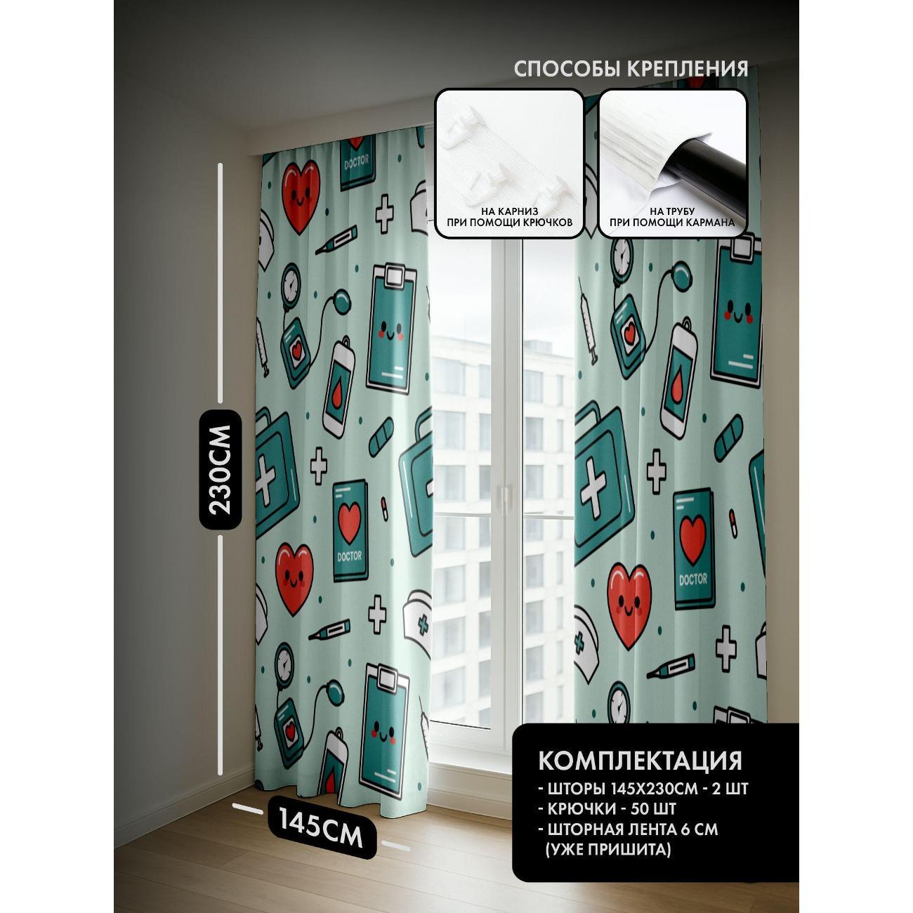 Комплект фотоштор 3D от бренда 365home с дизайном - Медицинский паттерн: аптечка, сердце, градусник, шприц, таблетки. Оригинальное решение, позволяющее обновить ваш дом, придать ему неповторимый стиль, красоту и подарить его обитателям комфорт и уют, а также стать надёжной защитой от городского шума и холода зимой.