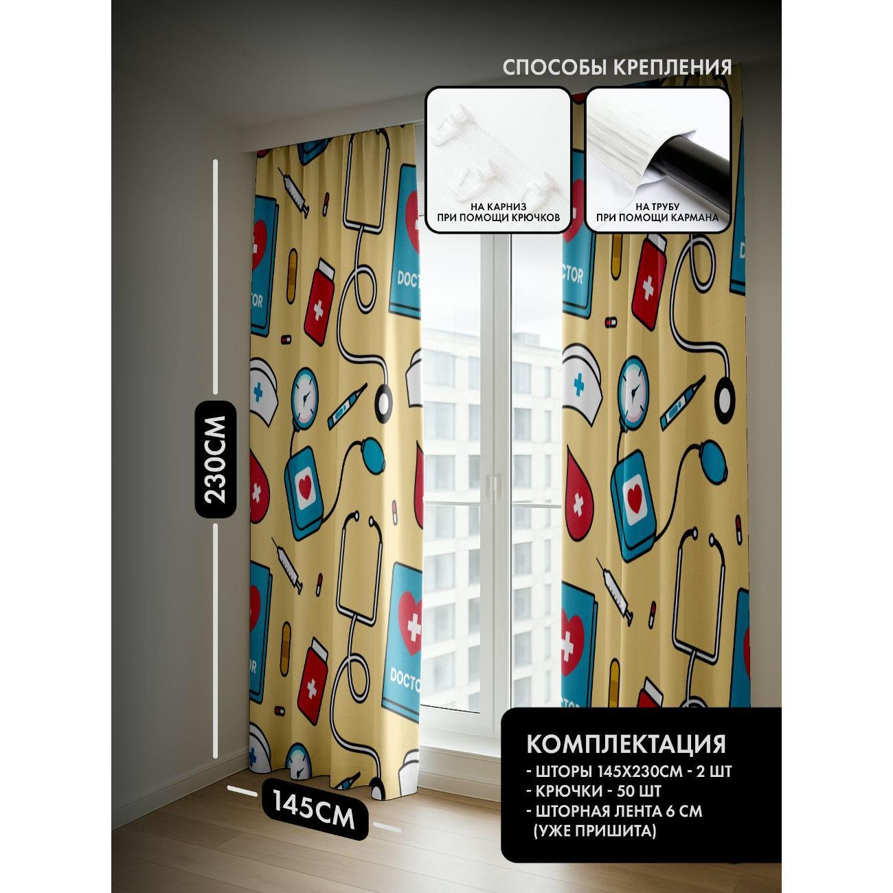 Комплект фотоштор 3D от бренда 365home с дизайном - Медицинский паттерн: стетоскоп, аптечка, шприц, таблетки, тонометр, шапочка медсестры, значки "DOCTOR" и сердца.. Оригинальное решение, позволяющее обновить ваш дом, придать ему неповторимый стиль, красоту и подарить его обитателям комфорт и уют, а также стать надёжной защитой от городского шума и холода зимой.