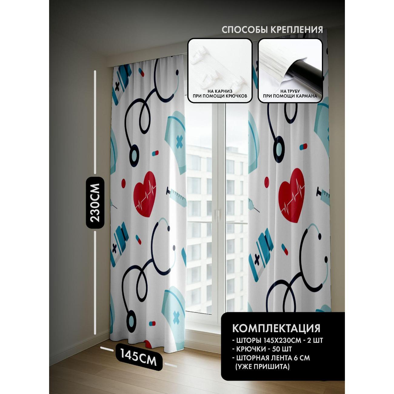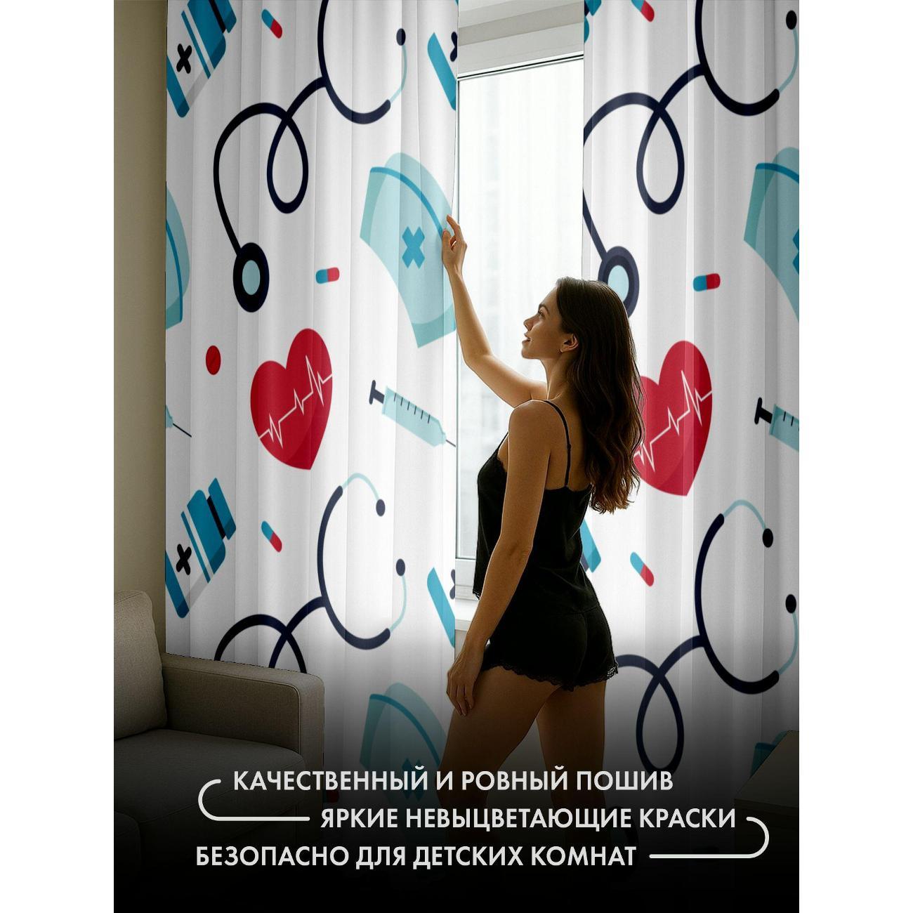 Комплект фотоштор 3D от бренда 365home с дизайном - Медицинский узор: стетоскоп, сердце, шприц, шапочка, таблетки.. Оригинальное решение, позволяющее обновить ваш дом, придать ему неповторимый стиль, красоту и подарить его обитателям комфорт и уют, а также стать надёжной защитой от городского шума и холода зимой.