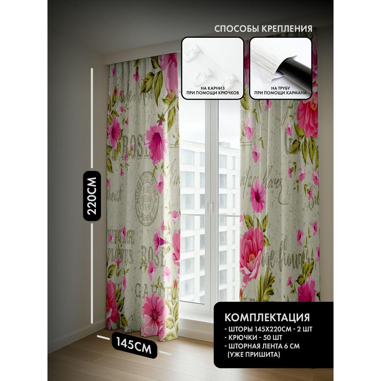 Комплект фотоштор 3D от бренда 365home с дизайном - Розовые цветы и винтажные надписи на светлом фоне. Оригинальное решение, позволяющее обновить ваш дом, придать ему неповторимый стиль, красоту и подарить его обитателям комфорт и уют, а также стать надёжной защитой от городского шума и холода зимой.