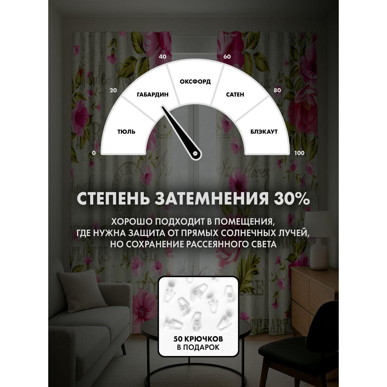 Степень затемнения - 30%. Два способа крепления - на карниз с помощью крючков и на трубу при помощи кармана. Высота 220 см, ширина одного полотна - 145 см. В комплекте 2 полотна. Тон изображения может незначительно отличаться от представленной на сайте фотографии. Тыльная сторона портьеры не имеет изображения.