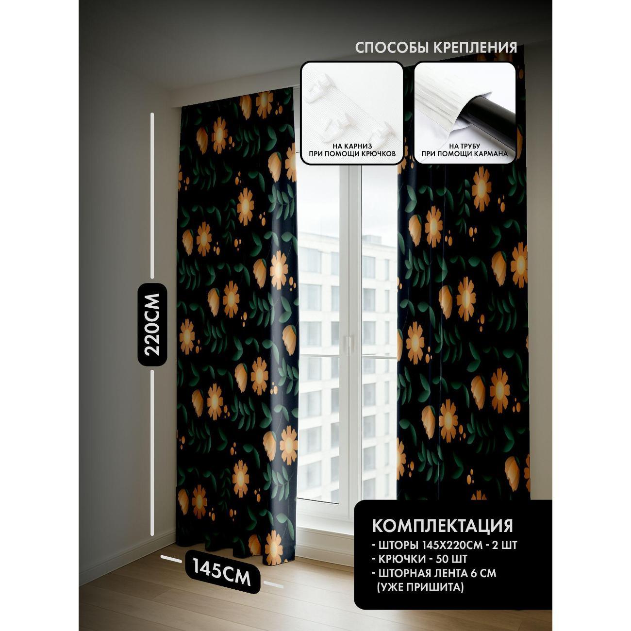 Комплект фотоштор 3D от бренда 365home с дизайном - Тёмный фон с оранжевыми цветами и зелёными листьями. Оригинальное решение, позволяющее обновить ваш дом, придать ему неповторимый стиль, красоту и подарить его обитателям комфорт и уют, а также стать надёжной защитой от городского шума и холода зимой.