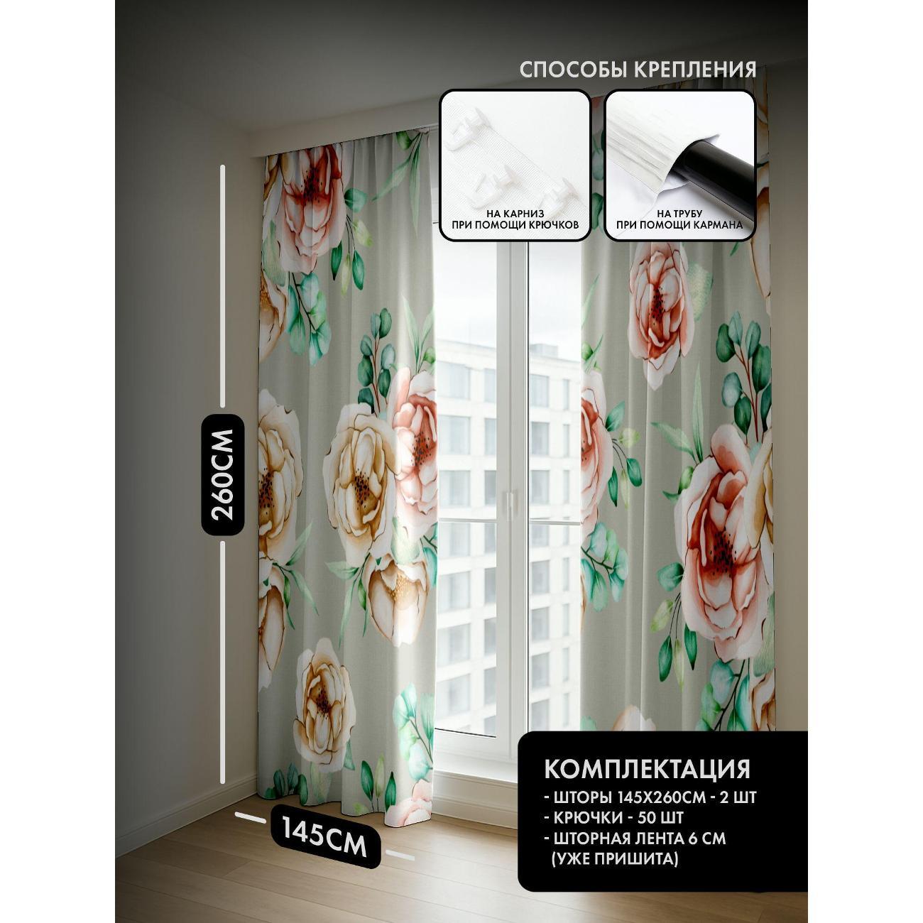 Комплект фотоштор 3D от бренда 365home с дизайном - Акварельные розы и зелень на светлом фоне. Оригинальное решение, позволяющее обновить ваш дом, придать ему неповторимый стиль, красоту и подарить его обитателям комфорт и уют, а также стать надёжной защитой от городского шума и холода зимой.