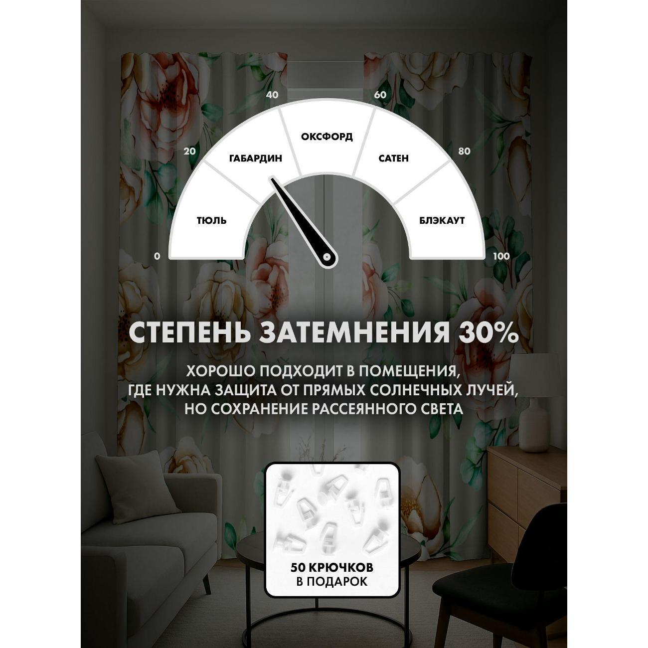 Степень затемнения - 30%. Два способа крепления - на карниз с помощью крючков и на трубу при помощи кармана. Высота 260 см, ширина одного полотна - 145 см. В комплекте 2 полотна. Тон изображения может незначительно отличаться от представленной на сайте фотографии. Тыльная сторона портьеры не имеет изображения.