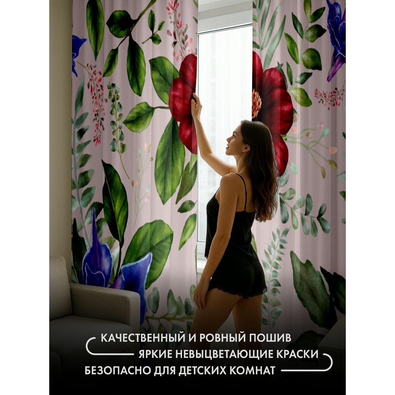 Комплект фотоштор 3D от бренда 365home с дизайном - Акварельный узор: красные и синие цветы с зелёной листвой. Оригинальное решение, позволяющее обновить ваш дом, придать ему неповторимый стиль, красоту и подарить его обитателям комфорт и уют, а также стать надёжной защитой от городского шума и холода зимой.