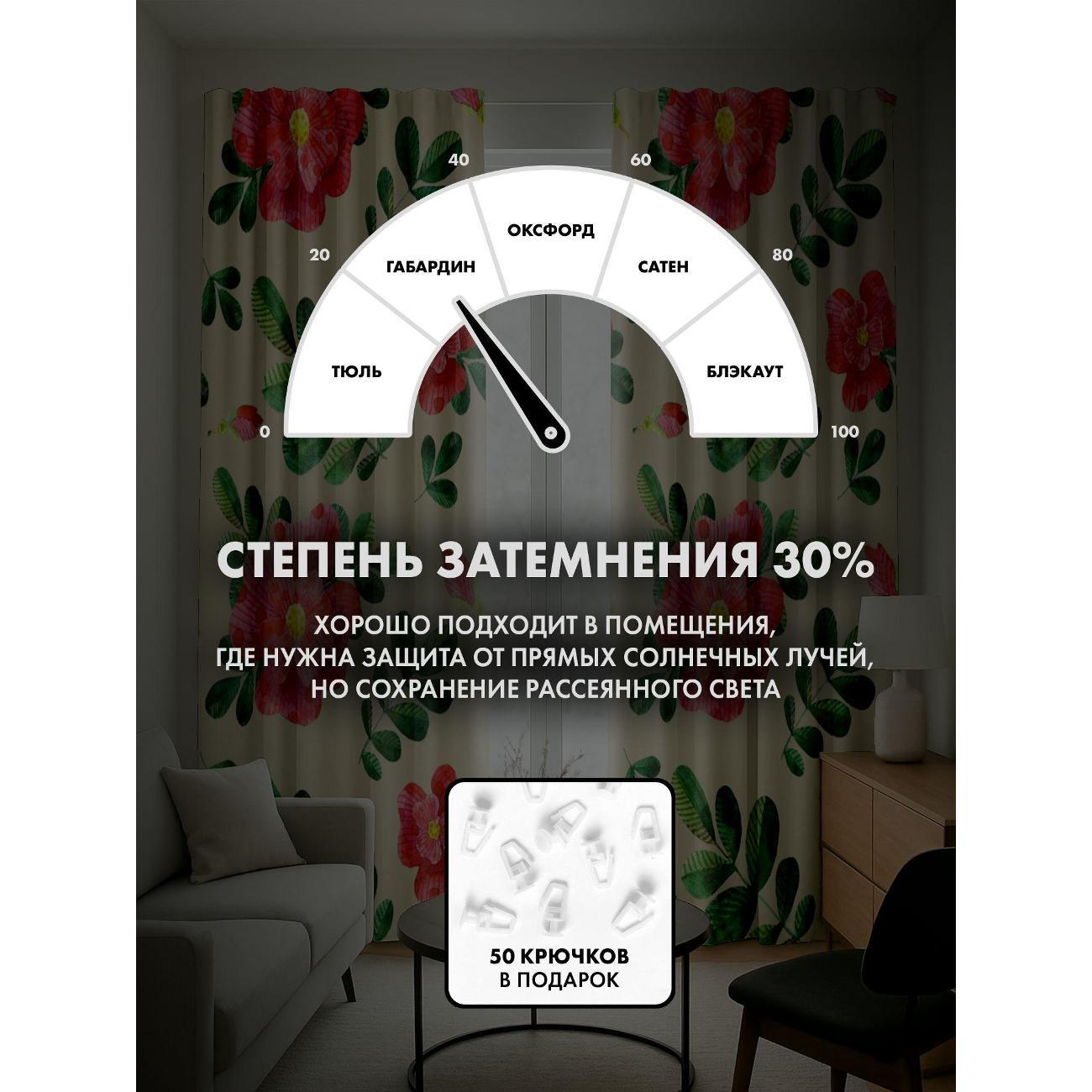 Степень затемнения - 30%. Два способа крепления - на карниз с помощью крючков и на трубу при помощи кармана. Высота 220 см, ширина одного полотна - 145 см. В комплекте 2 полотна. Тон изображения может незначительно отличаться от представленной на сайте фотографии. Тыльная сторона портьеры не имеет изображения.