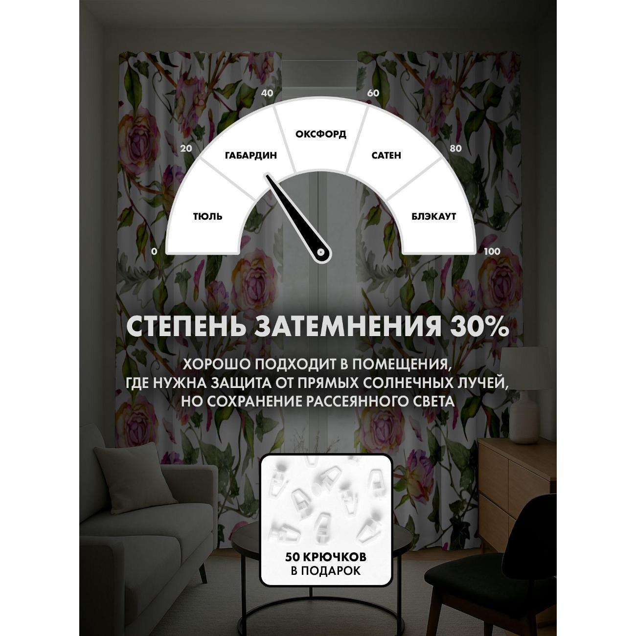 Степень затемнения - 30%. Два способа крепления - на карниз с помощью крючков и на трубу при помощи кармана. Высота 240 см, ширина одного полотна - 145 см. В комплекте 2 полотна. Тон изображения может незначительно отличаться от представленной на сайте фотографии. Тыльная сторона портьеры не имеет изображения.