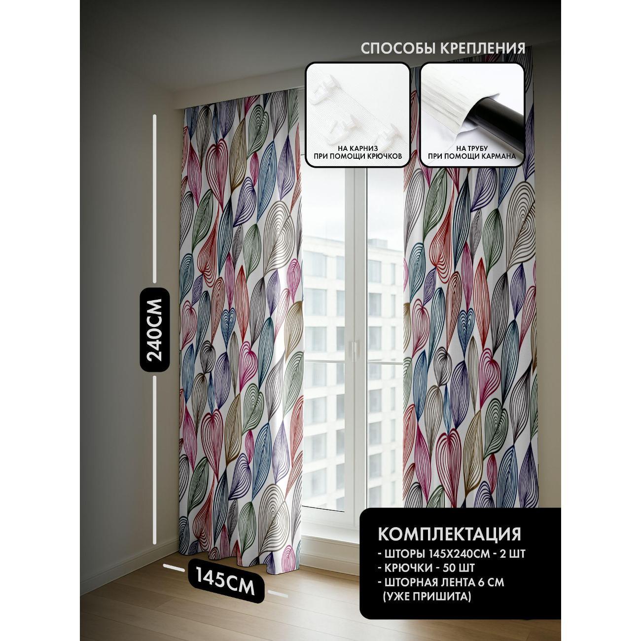 Комплект фотоштор 3D от бренда 365home с дизайном - Бесшовный узор из разноцветных контурных листьев. Оригинальное решение, позволяющее обновить ваш дом, придать ему неповторимый стиль, красоту и подарить его обитателям комфорт и уют, а также стать надёжной защитой от городского шума и холода зимой.