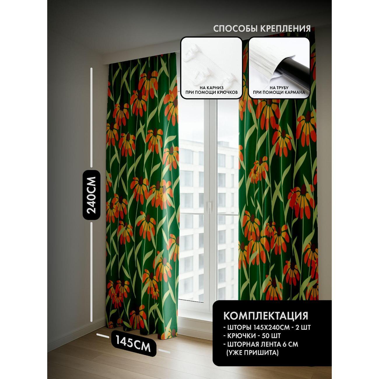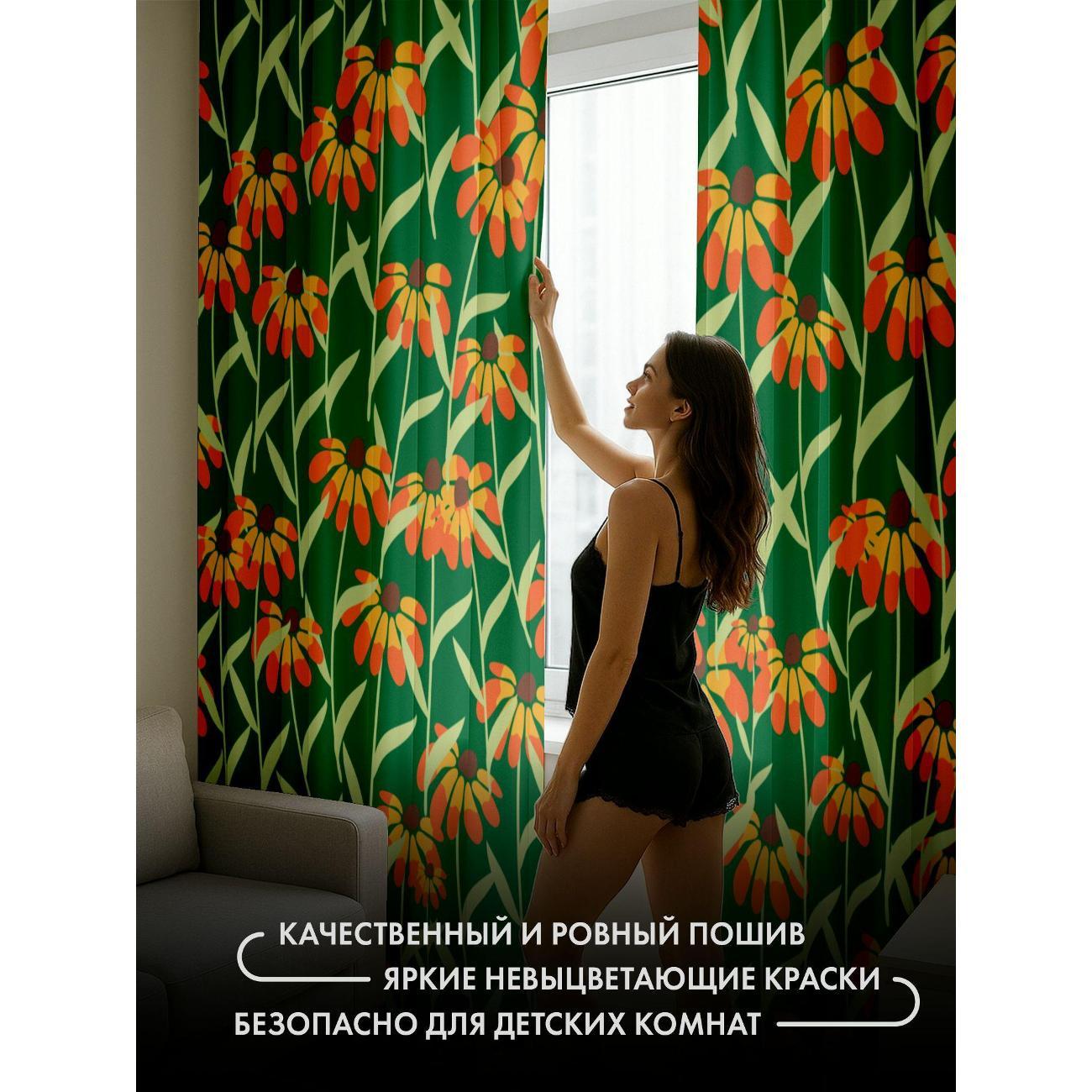 Комплект фотоштор 3D от бренда 365home с дизайном - Бесшовный узор: оранжево-жёлтые цветы на зелёном фоне. Оригинальное решение, позволяющее обновить ваш дом, придать ему неповторимый стиль, красоту и подарить его обитателям комфорт и уют, а также стать надёжной защитой от городского шума и холода зимой.