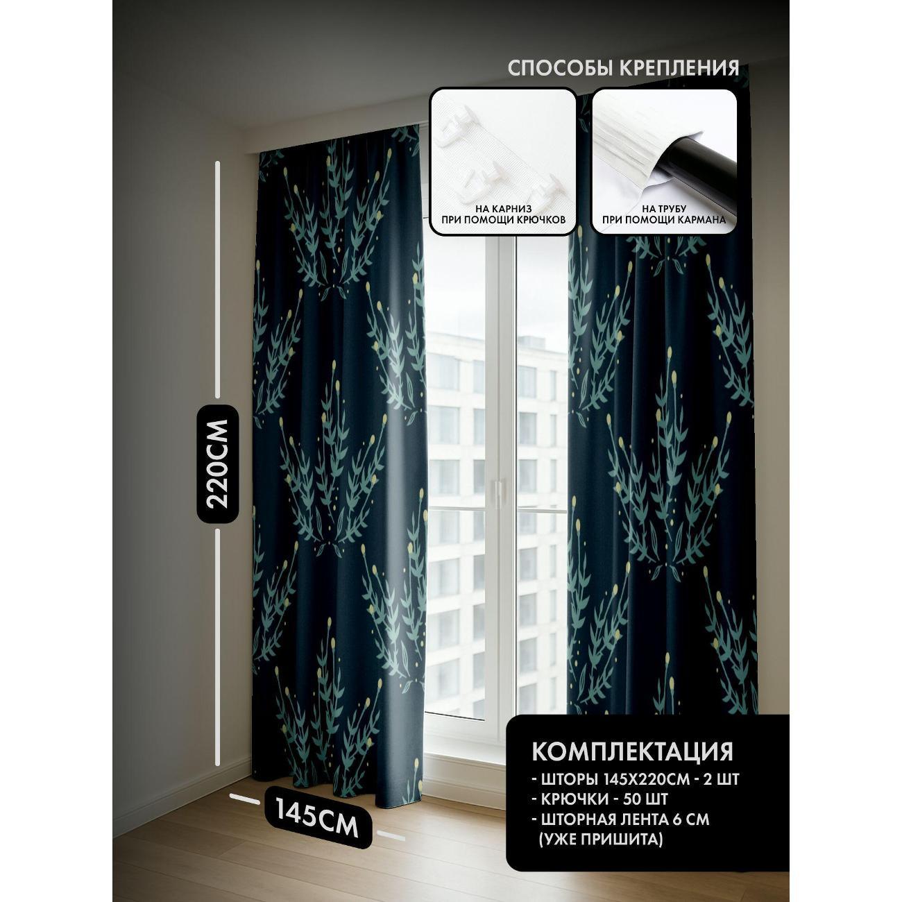 Степень затемнения - 30%. Два способа крепления - на карниз с помощью крючков и на трубу при помощи кармана. Высота 220 см, ширина одного полотна - 145 см. В комплекте 2 полотна. Тон изображения может незначительно отличаться от представленной на сайте фотографии. Тыльная сторона портьеры не имеет изображения.