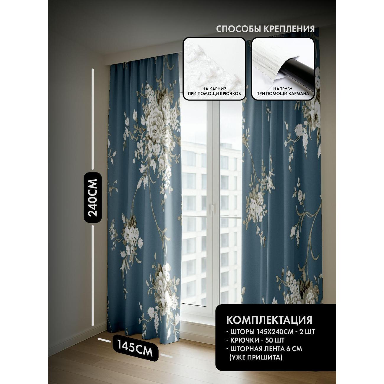 Комплект фотоштор 3D от бренда 365home с дизайном - Цветочные букеты в бежево-белых тонах на голубом фоне. Оригинальное решение, позволяющее обновить ваш дом, придать ему неповторимый стиль, красоту и подарить его обитателям комфорт и уют, а также стать надёжной защитой от городского шума и холода зимой.