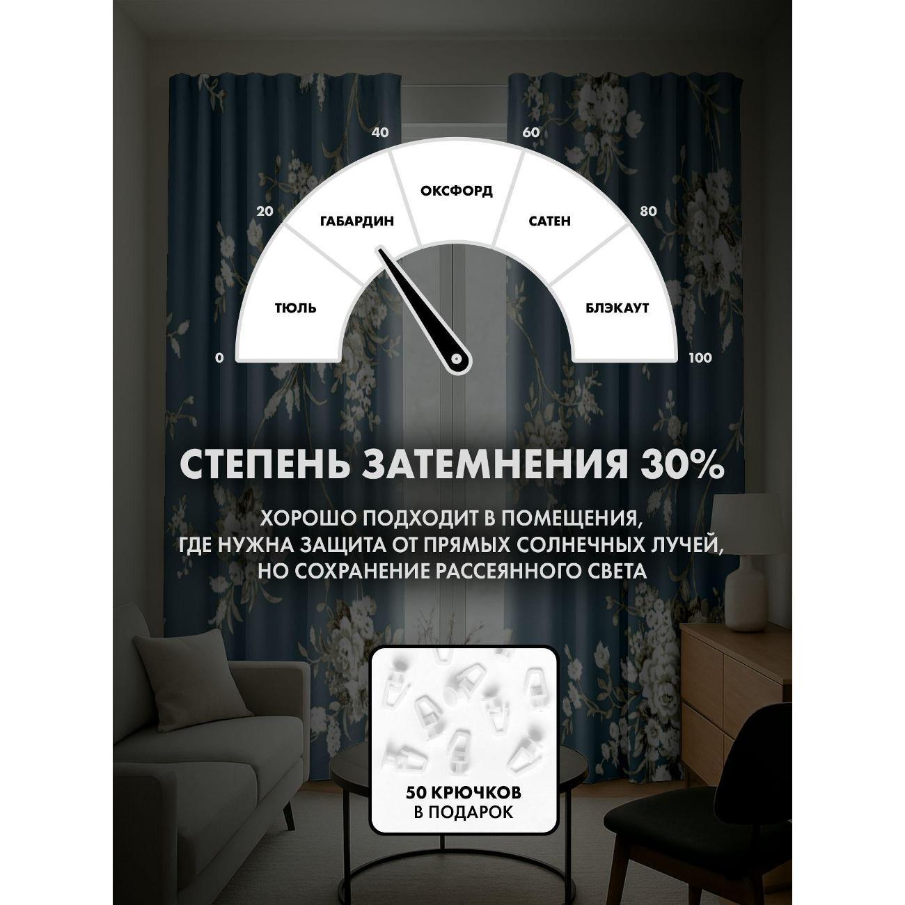 Степень затемнения - 30%. Два способа крепления - на карниз с помощью крючков и на трубу при помощи кармана. Высота 240 см, ширина одного полотна - 145 см. В комплекте 2 полотна. Тон изображения может незначительно отличаться от представленной на сайте фотографии. Тыльная сторона портьеры не имеет изображения.