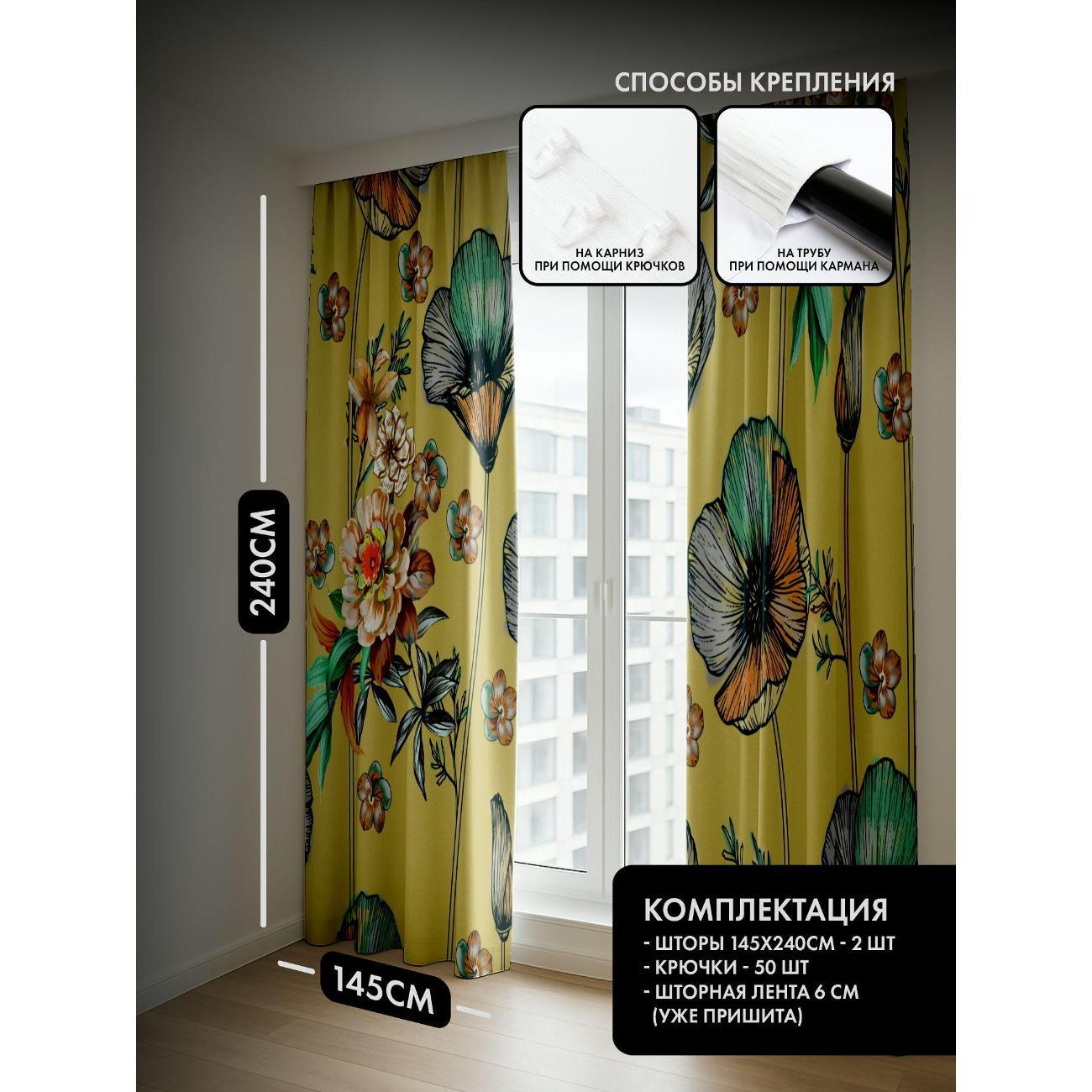 Комплект фотоштор 3D от бренда 365home с дизайном - Цветочные мотивы: маки, пионы, листья на жёлтом фоне. Оригинальное решение, позволяющее обновить ваш дом, придать ему неповторимый стиль, красоту и подарить его обитателям комфорт и уют, а также стать надёжной защитой от городского шума и холода зимой.