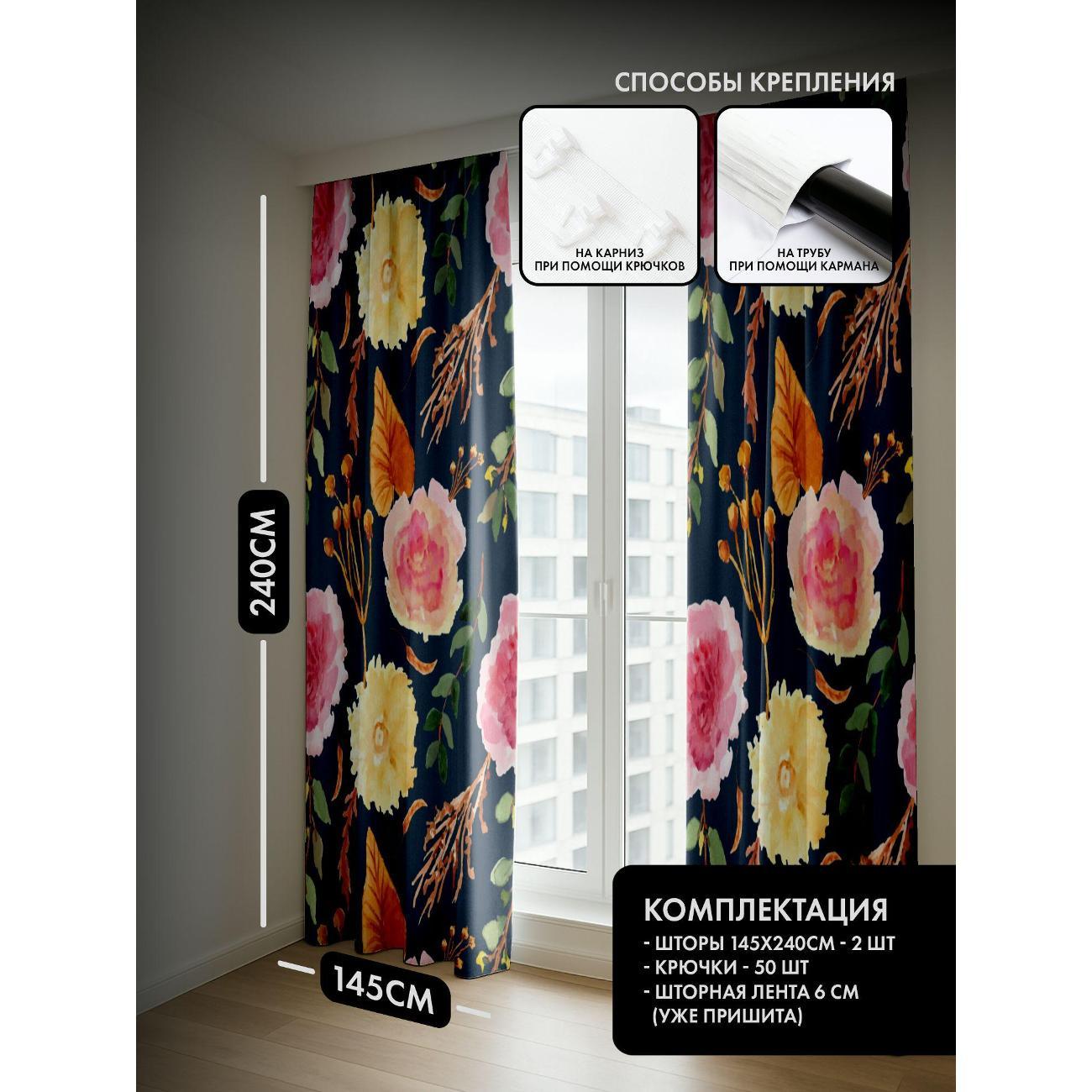 Комплект фотоштор 3D от бренда 365home с дизайном - Цветочные мотивы: розовые и жёлтые цветы на тёмно-синем фоне. Оригинальное решение, позволяющее обновить ваш дом, придать ему неповторимый стиль, красоту и подарить его обитателям комфорт и уют, а также стать надёжной защитой от городского шума и холода зимой.