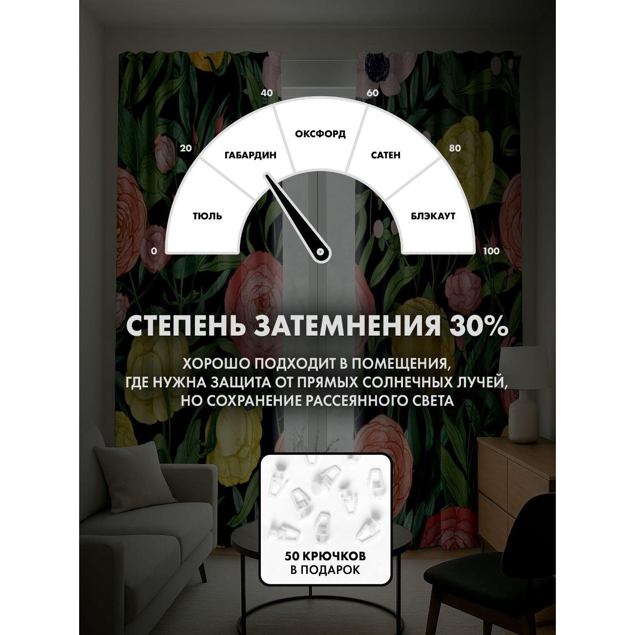 Степень затемнения - 30%. Два способа крепления - на карниз с помощью крючков и на трубу при помощи кармана. Высота 240 см, ширина одного полотна - 145 см. В комплекте 2 полотна. Тон изображения может незначительно отличаться от представленной на сайте фотографии. Тыльная сторона портьеры не имеет изображения.