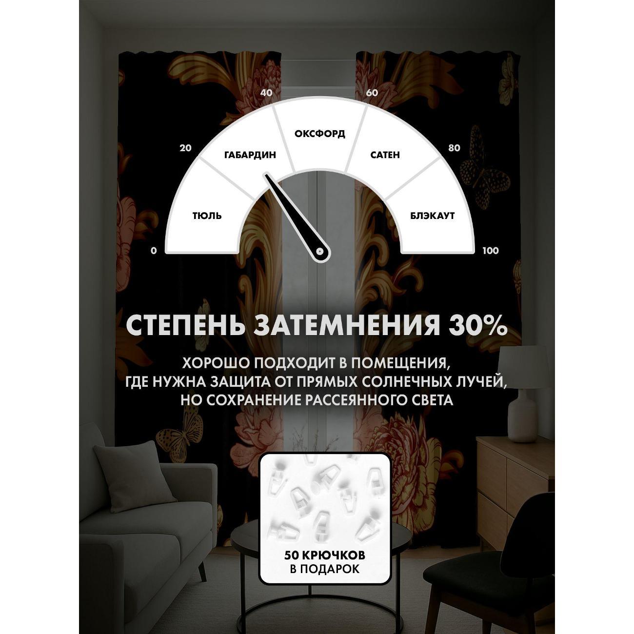 Степень затемнения - 30%. Два способа крепления - на карниз с помощью крючков и на трубу при помощи кармана. Высота 240 см, ширина одного полотна - 145 см. В комплекте 2 полотна. Тон изображения может незначительно отличаться от представленной на сайте фотографии. Тыльная сторона портьеры не имеет изображения.