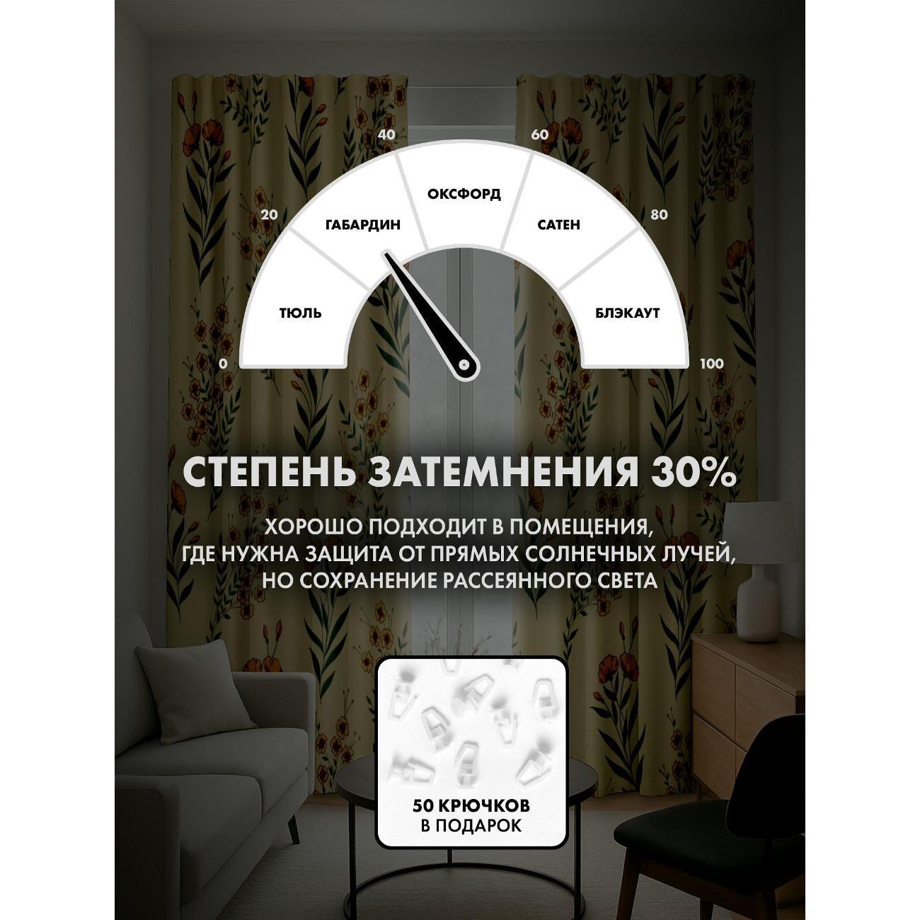 Шторы изготовлены из высококачественного материала Габардин плотностью 160 гр./см. Материал отличается высокой износостойкостью, сохраняя легкость, благодаря чему поддаются драпировке.