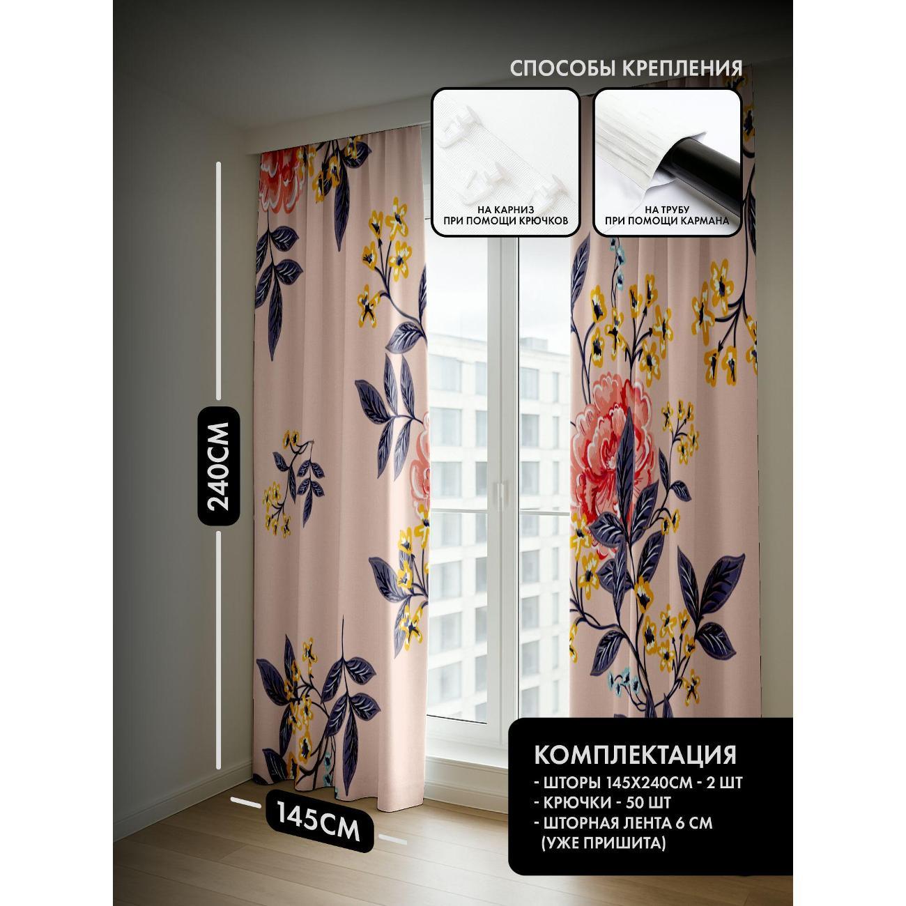 Степень затемнения - 30%. Два способа крепления - на карниз с помощью крючков и на трубу при помощи кармана. Высота 240 см, ширина одного полотна - 145 см. В комплекте 2 полотна. Тон изображения может незначительно отличаться от представленной на сайте фотографии. Тыльная сторона портьеры не имеет изображения.