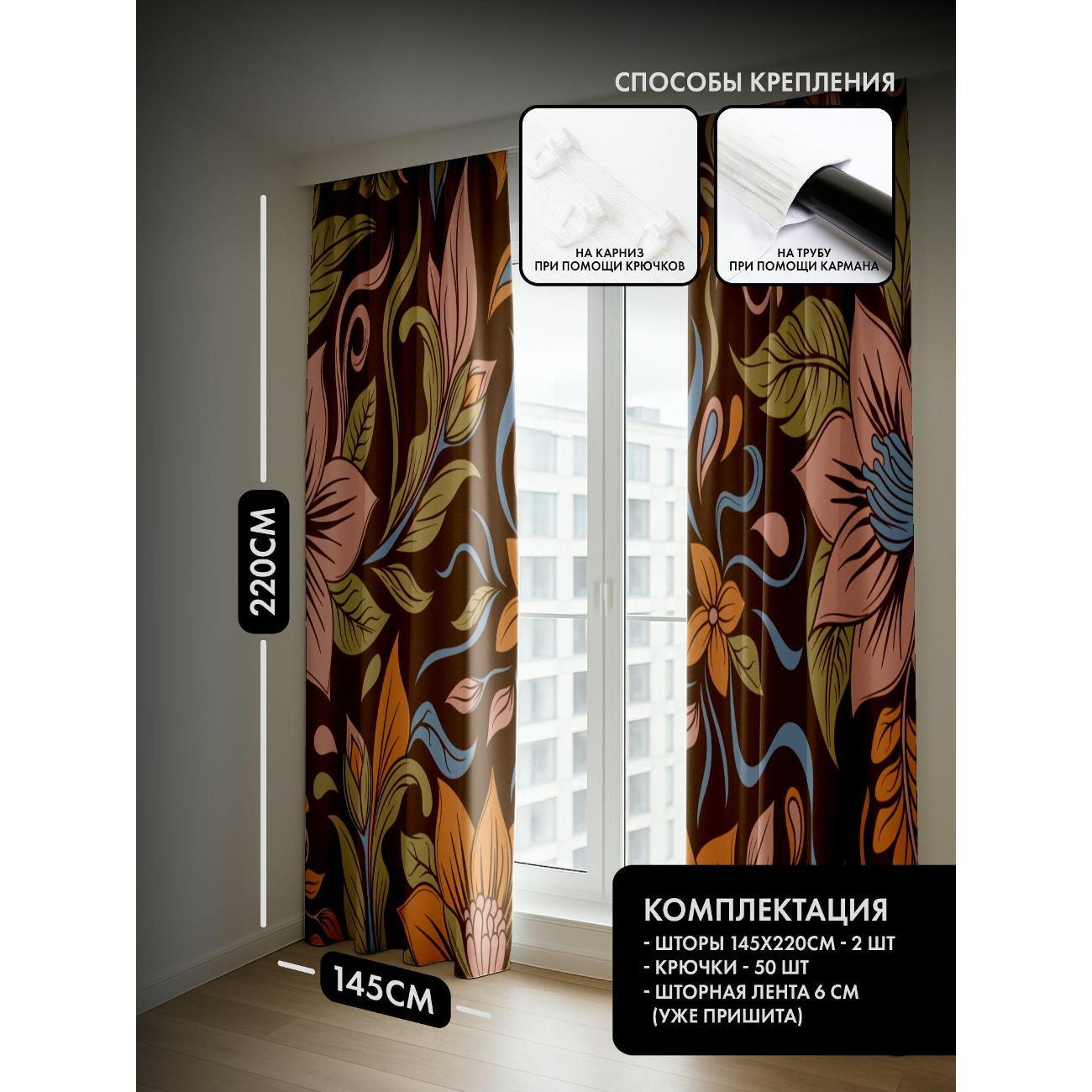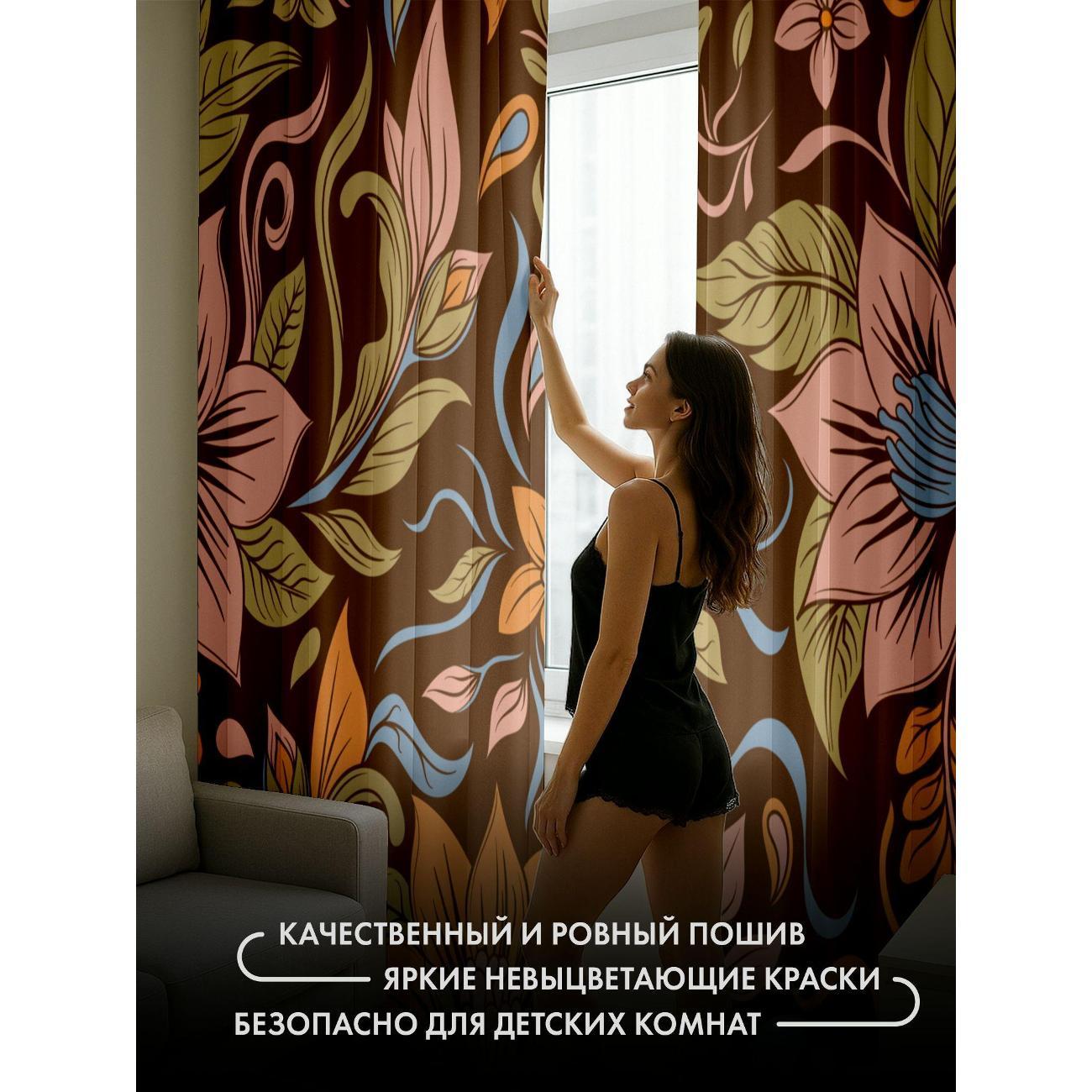 Комплект фотоштор 3D от бренда 365home с дизайном - Цветочный узор: оранжевые, розовые, голубые цветы на коричневом фоне. Оригинальное решение, позволяющее обновить ваш дом, придать ему неповторимый стиль, красоту и подарить его обитателям комфорт и уют, а также стать надёжной защитой от городского шума и холода зимой.