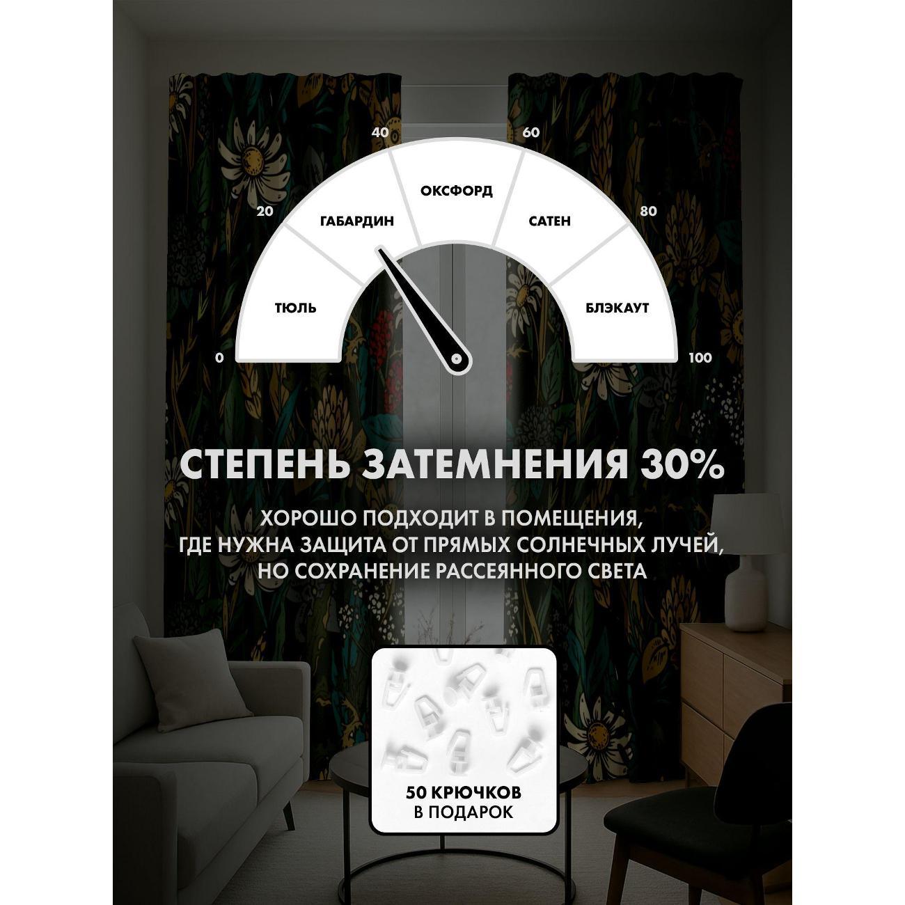 Степень затемнения - 30%. Два способа крепления - на карниз с помощью крючков и на трубу при помощи кармана. Высота 260 см, ширина одного полотна - 145 см. В комплекте 2 полотна. Тон изображения может незначительно отличаться от представленной на сайте фотографии. Тыльная сторона портьеры не имеет изображения.