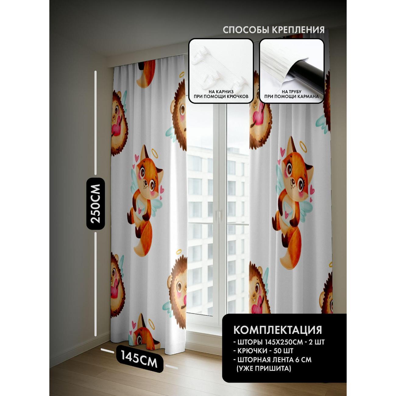 Комплект фотоштор 3D от бренда 365home с дизайном - Милые лисы и ёжики с крыльями, сердечки и нимбы. Оригинальное решение, позволяющее обновить ваш дом, придать ему неповторимый стиль, красоту и подарить его обитателям комфорт и уют, а также стать надёжной защитой от городского шума и холода зимой.