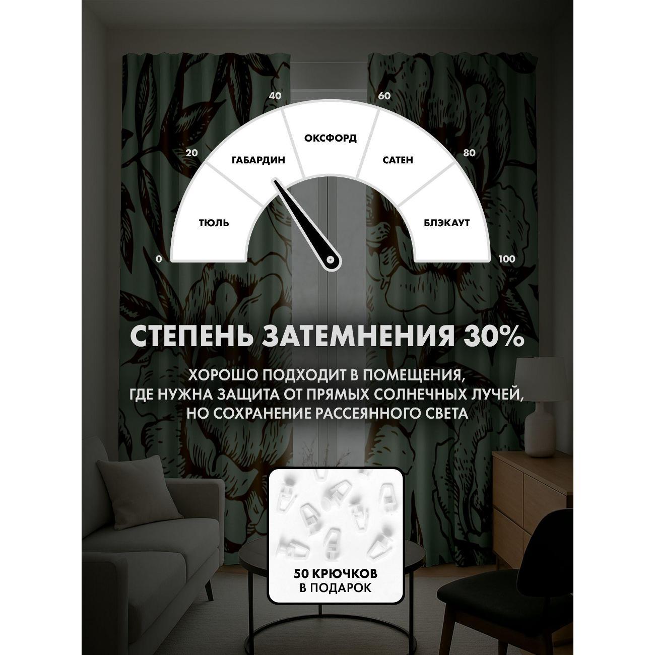 Степень затемнения - 30%. Два способа крепления - на карниз с помощью крючков и на трубу при помощи кармана. Высота 240 см, ширина одного полотна - 145 см. В комплекте 2 полотна. Тон изображения может незначительно отличаться от представленной на сайте фотографии. Тыльная сторона портьеры не имеет изображения.