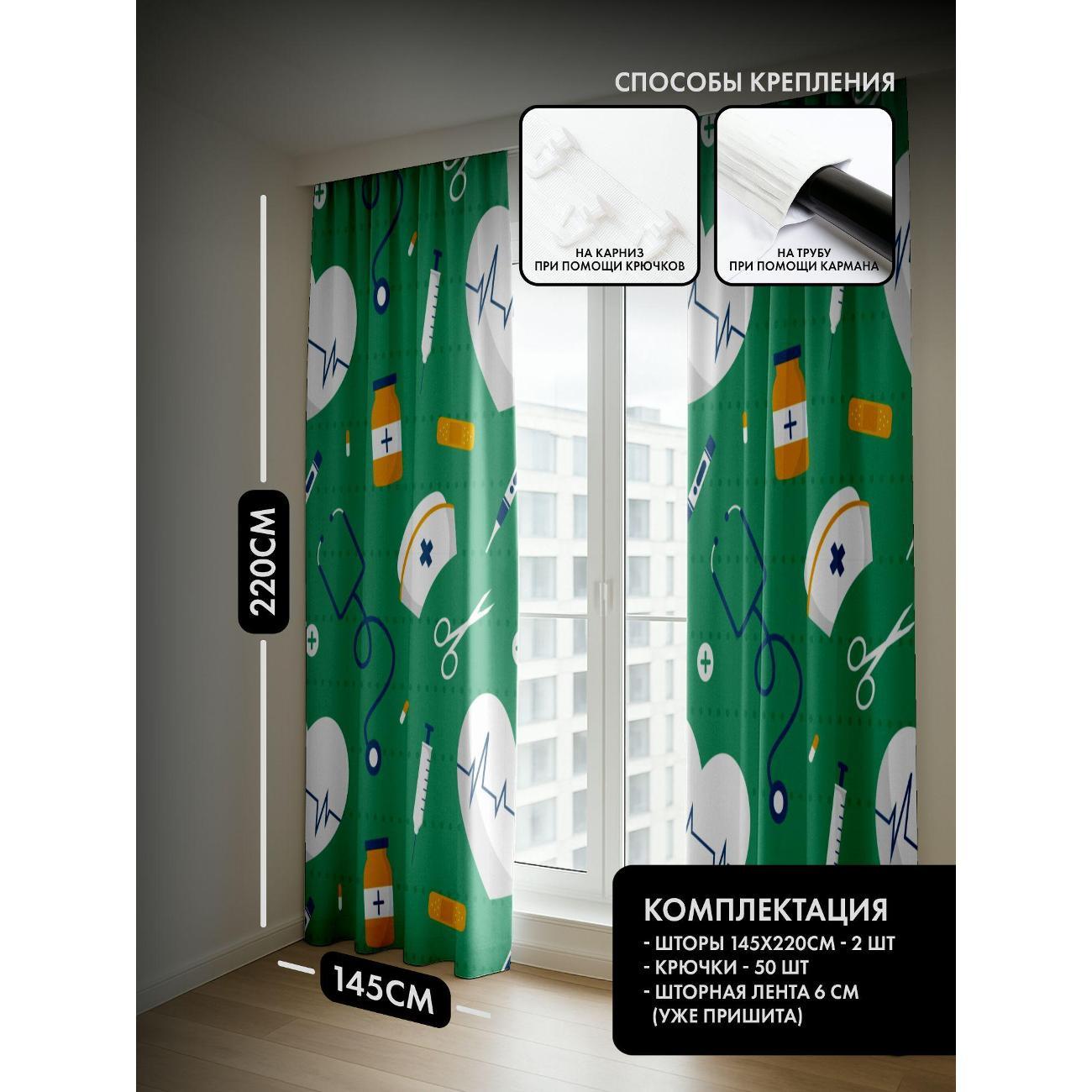 Комплект фотоштор 3D от бренда 365home с дизайном - Медицинские символы: сердца, стетоскоп, шприц, таблетки, ножницы, шапочка.. Оригинальное решение, позволяющее обновить ваш дом, придать ему неповторимый стиль, красоту и подарить его обитателям комфорт и уют, а также стать надёжной защитой от городского шума и холода зимой.