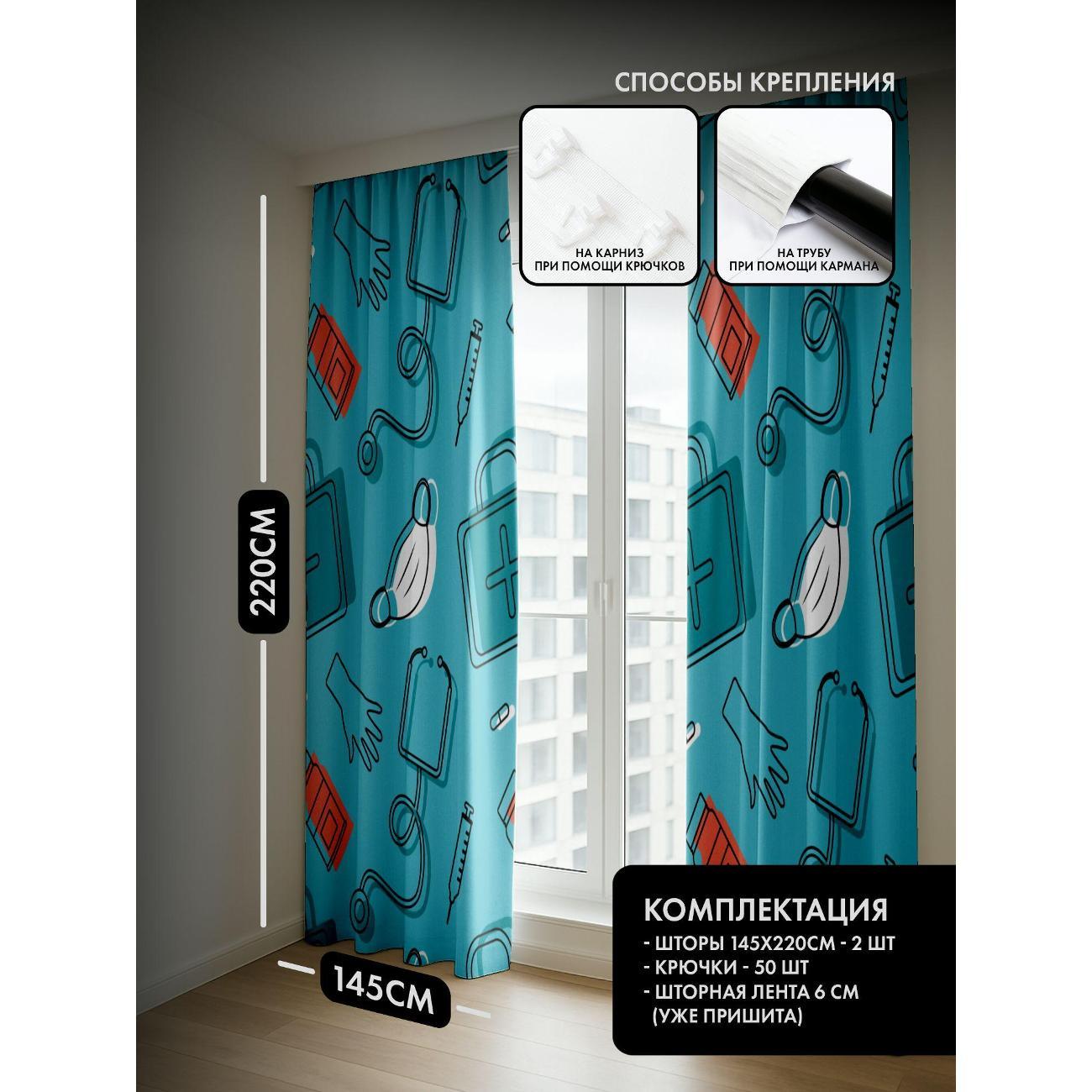 Комплект фотоштор 3D от бренда 365home с дизайном - Медицинский паттерн: стетоскоп, аптечка, перчатки, шприц. Оригинальное решение, позволяющее обновить ваш дом, придать ему неповторимый стиль, красоту и подарить его обитателям комфорт и уют, а также стать надёжной защитой от городского шума и холода зимой.