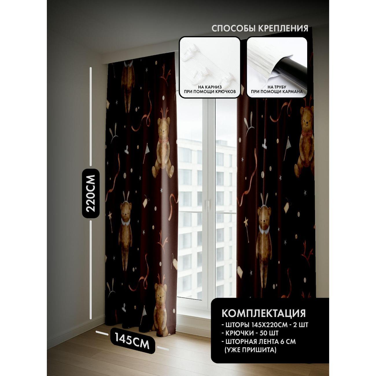Комплект фотоштор 3D от бренда 365home с дизайном - Медвежата с ушками и рожками, ленты, звёзды, флажки на тёмно-коричневом фоне. Оригинальное решение, позволяющее обновить ваш дом, придать ему неповторимый стиль, красоту и подарить его обитателям комфорт и уют, а также стать надёжной защитой от городского шума и холода зимой.