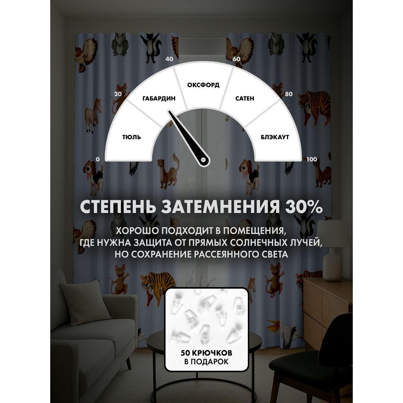 Степень затемнения - 30%. Два способа крепления - на карниз с помощью крючков и на трубу при помощи кармана. Высота 220 см, ширина одного полотна - 145 см. В комплекте 2 полотна. Тон изображения может незначительно отличаться от представленной на сайте фотографии. Тыльная сторона портьеры не имеет изображения.