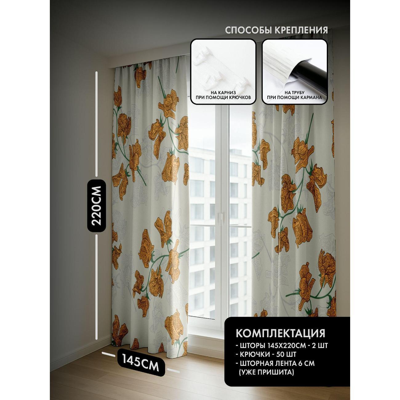 Комплект фотоштор 3D от бренда 365home с дизайном - Оранжевые цветы на зелёных стеблях, светлый фон. Оригинальное решение, позволяющее обновить ваш дом, придать ему неповторимый стиль, красоту и подарить его обитателям комфорт и уют, а также стать надёжной защитой от городского шума и холода зимой.