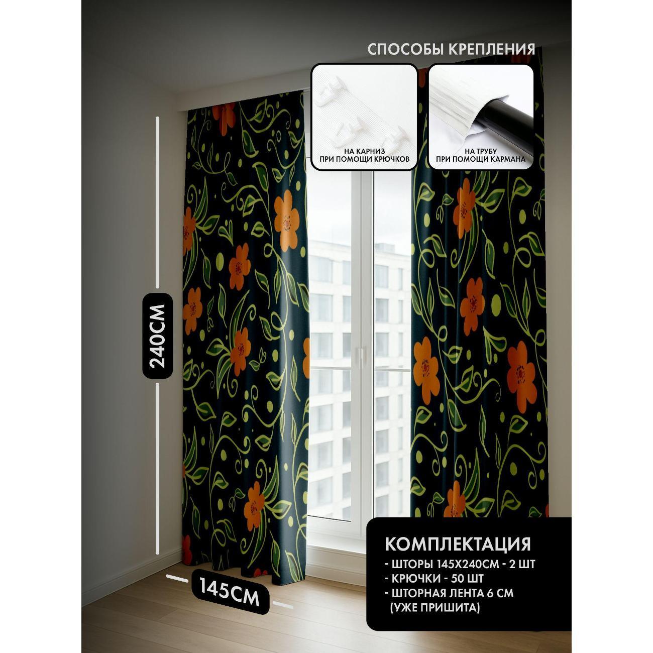 Комплект фотоштор 3D от бренда 365home с дизайном - Оранжевые цветы с зелёными листьями на тёмно-синем фоне. Оригинальное решение, позволяющее обновить ваш дом, придать ему неповторимый стиль, красоту и подарить его обитателям комфорт и уют, а также стать надёжной защитой от городского шума и холода зимой.