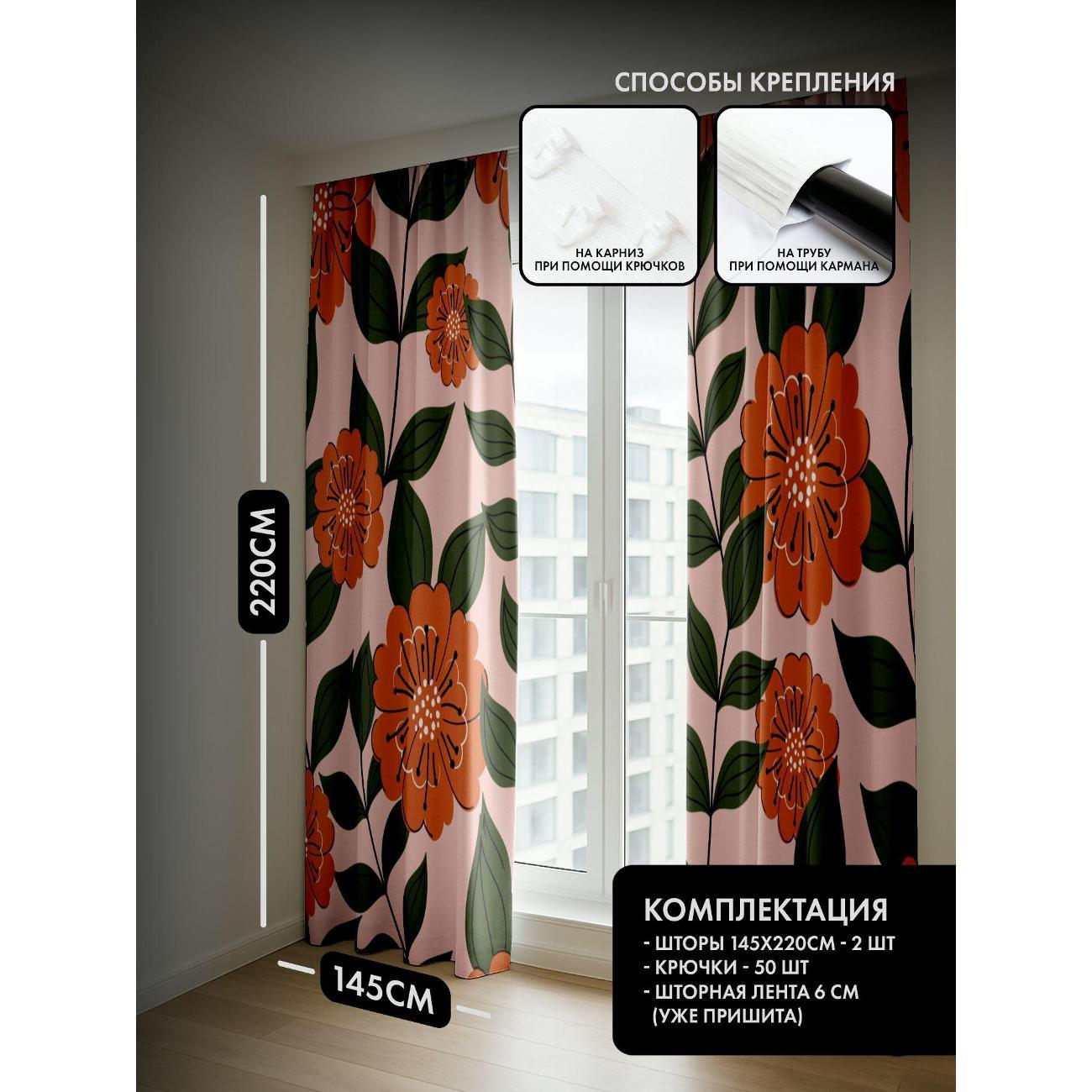 Комплект фотоштор 3D от бренда 365home с дизайном - Оранжевые цветы с зелёными листьями на розовом фоне. Оригинальное решение, позволяющее обновить ваш дом, придать ему неповторимый стиль, красоту и подарить его обитателям комфорт и уют, а также стать надёжной защитой от городского шума и холода зимой.