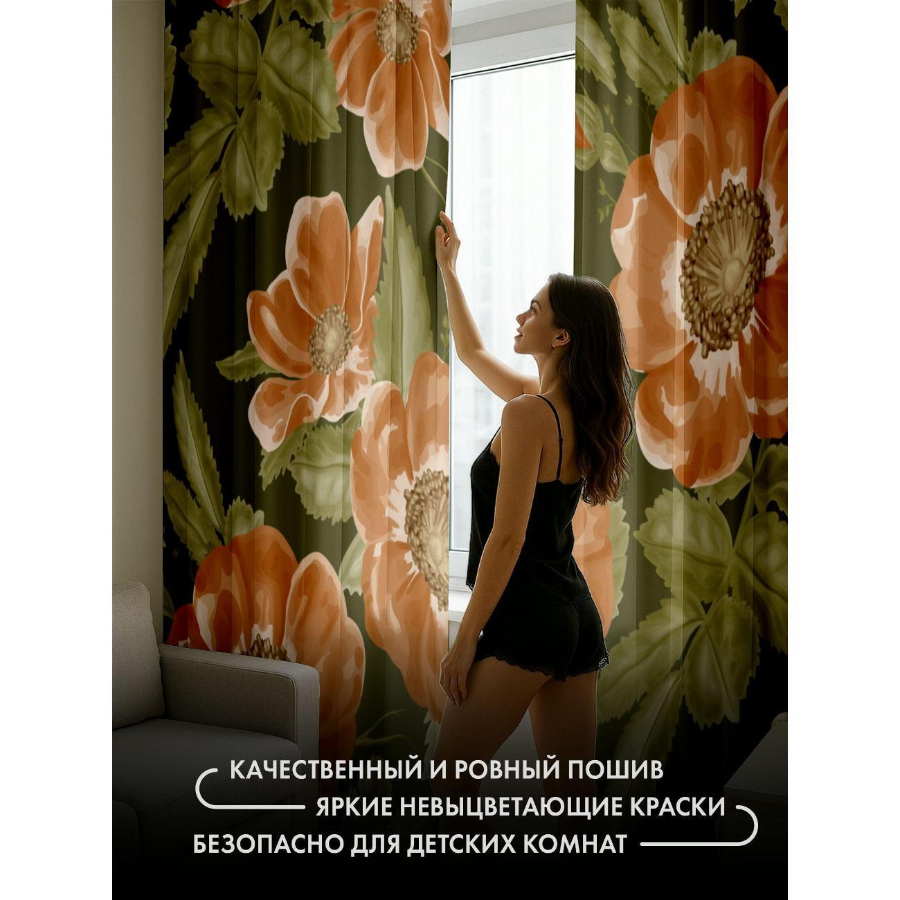 Комплект фотоштор 3D от бренда 365home с дизайном - Оранжевые цветы с зелёными листьями на тёмно-зелёном фоне. Оригинальное решение, позволяющее обновить ваш дом, придать ему неповторимый стиль, красоту и подарить его обитателям комфорт и уют, а также стать надёжной защитой от городского шума и холода зимой.
