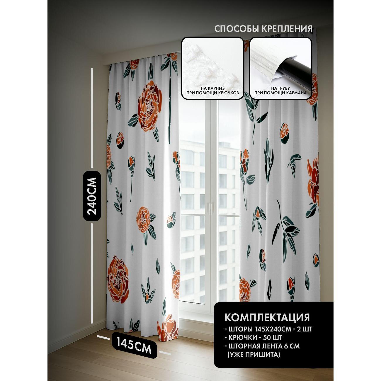 Комплект фотоштор 3D от бренда 365home с дизайном - Оранжевые пионы с зелёными листьями на белом фоне. Оригинальное решение, позволяющее обновить ваш дом, придать ему неповторимый стиль, красоту и подарить его обитателям комфорт и уют, а также стать надёжной защитой от городского шума и холода зимой.