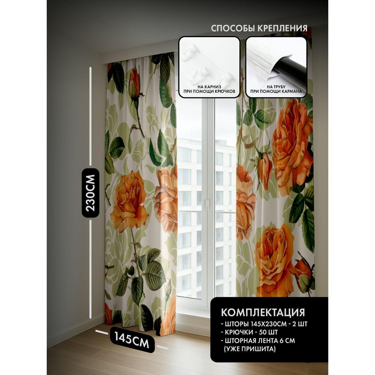 Комплект фотоштор 3D от бренда 365home с дизайном - Оранжевые розы с зелёными листьями на светлом фоне. Оригинальное решение, позволяющее обновить ваш дом, придать ему неповторимый стиль, красоту и подарить его обитателям комфорт и уют, а также стать надёжной защитой от городского шума и холода зимой.